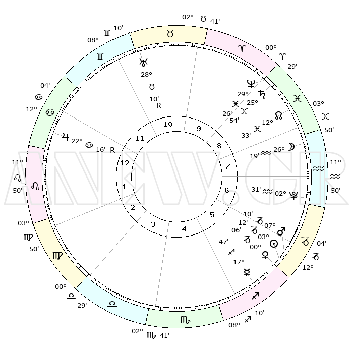 | | ΘΕΣΕΙΣ ΠΛΑΝΗΤΩΝ ΑΣΤΡΟΛΟΓΙΚΟΥ ΧΑΡΤΗ ΤΗΣ ΣΤΙΓΜΗΣ ΑΥΤΗΣ | | | | Πλανήτης | Ζώδιο | Μοίρες | Δεκαήμ. | Σε οίκο | Απόκλιση | | Ακμές των οίκων | | Ηλιος | Αιγόκερως | 03°07' | Πρώτο | 6 | 23 S 24 | | 1ος | 20°17' | Καρκίνος | | Σελήνη | Υδροχόος | 25°23' | Τρίτο | 8 | 14 S 22 | | 2ος | 10°50' | Λέων | | Ερμής | Τοξότης | 17°40' | Δεύτερο | 6 | 22 S 34 | | 3ος | 04°36' | Παρθένος | | Αφροδίτη | Αιγόκερως | 00°01' | Πρώτο | 6 | 23 S 39 | | 4ος | 04°16' | Ζυγός | | Αρης | Αιγόκερως | 07°07' | Πρώτο | 6 | 24 S 05 | | 5ος | 10°16' | Σκορπιός | | Δίας | Καρκίνος | 22°17'R | Τρίτο | 1 | 21 N 49 | | 6ος | 17°36' | Τοξότης | | Κρόνος | Ιχθείς | 25°54' | Τρίτο | 9 | 03 S 44 | | 7ος | 20°17' | Αιγόκερως | | Ουρανός | Ταύρος | 28°10'R | Τρίτο | 11 | 19 N 33 | | 8ος | 10°50' | Υδροχόος | | Ποσειδώνας | Ιχθείς | 29°26' | Τρίτο | 9 | 01 S 27 | | 9ος | 04°36' | Ιχθείς | | Πλούτωνας | Υδροχόος | 02°30' | Πρώτο | 7 | 23 S 16 | | 10ος | 04°16' | Κριός | | Β. Δεσμός | Ιχθείς | 12°33' | Δεύτερο | 9 | 06 S 51 | | 11ος | 10°16' | Ταύρος | | Ωροσκόπος | Καρκίνος | 20°17' | Τρίτο | | | 12ος | 17°36' | Δίδυμοι | | Μεσουράνημα | Κριός | 04°16' | Πρώτο | | | |