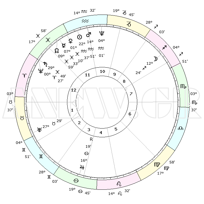 | | ΘΕΣΕΙΣ ΠΛΑΝΗΤΩΝ ΑΣΤΡΟΛΟΓΙΚΟΥ ΧΑΡΤΗ ΤΗΣ ΣΤΙΓΜΗΣ ΑΥΤΗΣ | | | | Πλανήτης | Ζώδιο | Μοίρες | Δεκαήμ. | Σε οίκο | Απόκλιση | | Ακμές των οίκων | | Ηλιος | Υδροχόος | 22°34' | Τρίτο | 12 | 13 S 59 | | 1ος | 00°07' | Κριός | | Σελήνη | Τοξότης | 11°41' | Δεύτερο | 9 | 27 S 23 | | 2ος | 10°23' | Ταύρος | | Ερμής | Ιχθείς | 07°27' | Πρώτο | 12 | 09 S 24 | | 3ος | 07°46' | Δίδυμοι | | Αφροδίτη | Ιχθείς | 01°05' | Πρώτο | 12 | 12 S 27 | | 4ος | 00°04' | Καρκίνος | | Αρης | Υδροχόος | 14°49' | Δεύτερο | 11 | 17 S 25 | | 5ος | 22°23' | Καρκίνος | | Δίας | Καρκίνος | 16°20'R | Δεύτερο | 4 | 22 N 45 | | 6ος | 19°48' | Λέων | | Κρόνος | Ιχθείς | 29°49' | Τρίτο | 12 | 02 S 03 | | 7ος | 00°07' | Ζυγός | | Ουρανός | Ταύρος | 27°29' | Τρίτο | 2 | 19 N 25 | | 8ος | 10°23' | Σκορπιός | | Ποσειδώνας | Κριός | 00°27' | Πρώτο | 1 | 01 S 01 | | 9ος | 07°46' | Τοξότης | | Πλούτωνας | Υδροχόος | 04°01' | Πρώτο | 11 | 22 S 58 | | 10ος | 00°04' | Αιγόκερως | | Β. Δεσμός | Ιχθείς | 09°59' | Πρώτο | 12 | 07 S 49 | | 11ος | 22°23' | Αιγόκερως | | Ωροσκόπος | Κριός | 00°07' | Πρώτο | | | 12ος | 19°48' | Υδροχόος | | Μεσουράνημα | Αιγόκερως | 00°04' | Πρώτο | | | |