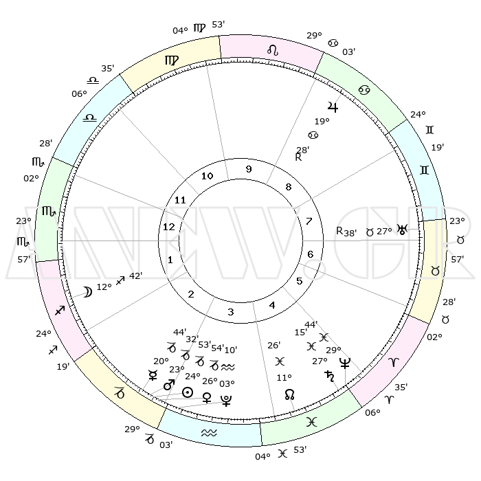 | | ΘΕΣΕΙΣ ΠΛΑΝΗΤΩΝ ΑΣΤΡΟΛΟΓΙΚΟΥ ΧΑΡΤΗ ΤΗΣ ΣΤΙΓΜΗΣ ΑΥΤΗΣ | | | | Πλανήτης | Ζώδιο | Μοίρες | Δεκαήμ. | Σε οίκο | Απόκλιση | | Ακμές των οίκων | | Ηλιος | Αιγόκερως | 24°49' | Τρίτο | 3 | 21 S 09 | | 1ος | 04°26' | Σκορπιός | | Σελήνη | Τοξότης | 11°54' | Δεύτερο | 2 | 27 S 17 | | 2ος | 03°08' | Τοξότης | | Ερμής | Αιγόκερως | 20°37' | Τρίτο | 3 | 23 S 37 | | 3ος | 05°28' | Αιγόκερως | | Αφροδίτη | Αιγόκερως | 26°49' | Τρίτο | 3 | 21 S 45 | | 4ος | 09°58' | Υδροχόος | | Αρης | Αιγόκερως | 23°29' | Τρίτο | 3 | 22 S 21 | | 5ος | 12°48' | Ιχθείς | | Δίας | Καρκίνος | 19°29'R | Δεύτερο | 9 | 22 N 17 | | 6ος | 11°03' | Κριός | | Κρόνος | Ιχθείς | 27°15' | Τρίτο | 5 | 03 S 08 | | 7ος | 04°26' | Ταύρος | | Ουρανός | Ταύρος | 27°38'R | Τρίτο | 7 | 19 N 26 | | 8ος | 03°08' | Δίδυμοι | | Ποσειδώνας | Ιχθείς | 29°44' | Τρίτο | 5 | 01 S 19 | | 9ος | 05°28' | Καρκίνος | | Πλούτωνας | Υδροχόος | 03°09' | Πρώτο | 3 | 23 S 08 | | 10ος | 09°58' | Λέων | | Β. Δεσμός | Ιχθείς | 11°26' | Δεύτερο | 4 | 07 S 17 | | 11ος | 12°48' | Παρθένος | | Ωροσκόπος | Σκορπιός | 04°26' | Πρώτο | | | 12ος | 11°03' | Ζυγός | | Μεσουράνημα | Λέων | 09°58' | Πρώτο | | | |