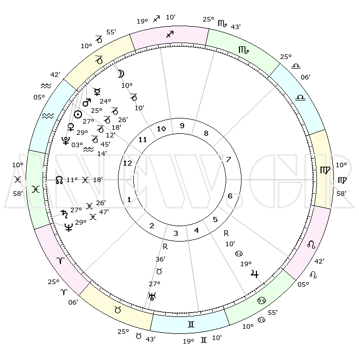 | | ΘΕΣΕΙΣ ΠΛΑΝΗΤΩΝ ΑΣΤΡΟΛΟΓΙΚΟΥ ΧΑΡΤΗ ΤΗΣ ΣΤΙΓΜΗΣ ΑΥΤΗΣ | | | | Πλανήτης | Ζώδιο | Μοίρες | Δεκαήμ. | Σε οίκο | Απόκλιση | | Ακμές των οίκων | | Ηλιος | Αιγόκερως | 27°08' | Τρίτο | 12 | 20 S 44 | | 1ος | 01°51' | Υδροχόος | | Σελήνη | Αιγόκερως | 09°13' | Πρώτο | 12 | 27 S 34 | | 2ος | 16°15' | Ιχθείς | | Ερμής | Αιγόκερως | 24°19' | Τρίτο | 12 | 23 S 07 | | 3ος | 24°24' | Κριός | | Αφροδίτη | Αιγόκερως | 29°40' | Τρίτο | 12 | 21 S 14 | | 4ος | 22°33' | Ταύρος | | Αρης | Αιγόκερως | 25°14' | Τρίτο | 12 | 22 S 03 | | 5ος | 15°10' | Δίδυμοι | | Δίας | Καρκίνος | 19°11'R | Δεύτερο | 6 | 22 N 20 | | 6ος | 06°40' | Καρκίνος | | Κρόνος | Ιχθείς | 27°26' | Τρίτο | 2 | 03 S 03 | | 7ος | 01°51' | Λέων | | Ουρανός | Ταύρος | 27°36'R | Τρίτο | 4 | 19 N 26 | | 8ος | 16°15' | Παρθένος | | Ποσειδώνας | Ιχθείς | 29°47' | Τρίτο | 2 | 01 S 18 | | 9ος | 24°24' | Ζυγός | | Πλούτωνας | Υδροχόος | 03°14' | Πρώτο | 1 | 23 S 07 | | 10ος | 22°33' | Σκορπιός | | Β. Δεσμός | Ιχθείς | 11°19' | Δεύτερο | 1 | 07 S 19 | | 11ος | 15°10' | Τοξότης | | Ωροσκόπος | Υδροχόος | 01°51' | Πρώτο | | | 12ος | 06°40' | Αιγόκερως | | Μεσουράνημα | Σκορπιός | 22°33' | Τρίτο | | | |