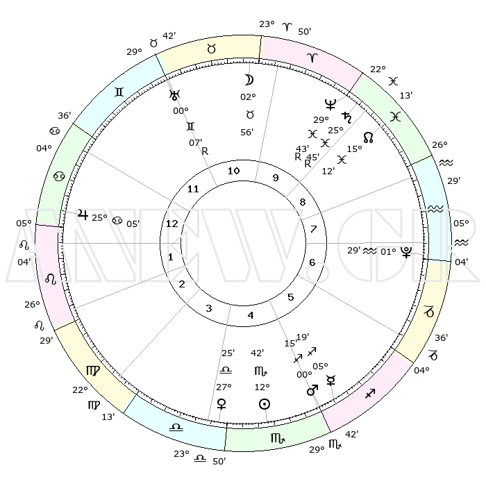 | | ΘΕΣΕΙΣ ΠΛΑΝΗΤΩΝ ΑΣΤΡΟΛΟΓΙΚΟΥ ΧΑΡΤΗ ΤΗΣ ΣΤΙΓΜΗΣ ΑΥΤΗΣ | | | | Πλανήτης | Ζώδιο | Μοίρες | Δεκαήμ. | Σε οίκο | Απόκλιση | | Ακμές των οίκων | | Ηλιος | Σκορπιός | 12°35' | Δεύτερο | 5 | 15 S 36 | | 1ος | 28°19' | Δίδυμοι | | Σελήνη | Ταύρος | 01°06' | Πρώτο | 11 | 15 N 11 | | 2ος | 19°13' | Καρκίνος | | Ερμής | Τοξότης | 05°14' | Πρώτο | 6 | 23 S 57 | | 3ος | 10°55' | Λέων | | Αφροδίτη | Ζυγός | 27°16' | Τρίτο | 5 | 09 S 10 | | 4ος | 06°58' | Παρθένος | | Αρης | Τοξότης | 00°10' | Πρώτο | 6 | 20 S 36 | | 5ος | 10°38' | Ζυγός | | Δίας | Καρκίνος | 25°04' | Τρίτο | 2 | 21 N 12 | | 6ος | 20°45' | Σκορπιός | | Κρόνος | Ιχθείς | 25°46'R | Τρίτο | 10 | 03 S 56 | | 7ος | 28°19' | Τοξότης | | Ουρανός | Δίδυμοι | 00°08'R | Πρώτο | 12 | 19 N 58 | | 8ος | 19°13' | Αιγόκερως | | Ποσειδώνας | Ιχθείς | 29°43'R | Τρίτο | 10 | 01 S 22 | | 9ος | 10°55' | Υδροχόος | | Πλούτωνας | Υδροχόος | 01°29' | Πρώτο | 8 | 23 S 30 | | 10ος | 06°58' | Ιχθείς | | Β. Δεσμός | Ιχθείς | 15°12' | Δεύτερο | 10 | 05 S 50 | | 11ος | 10°38' | Κριός | | Ωροσκόπος | Δίδυμοι | 28°19' | Τρίτο | | | 12ος | 20°45' | Ταύρος | | Μεσουράνημα | Ιχθείς | 06°58' | Πρώτο | | | |