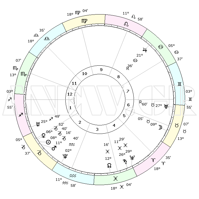 | | ΘΕΣΕΙΣ ΠΛΑΝΗΤΩΝ ΑΣΤΡΟΛΟΓΙΚΟΥ ΧΑΡΤΗ ΤΗΣ ΣΤΙΓΜΗΣ ΑΥΤΗΣ | | | | Πλανήτης | Ζώδιο | Μοίρες | Δεκαήμ. | Σε οίκο | Απόκλιση | | Ακμές των οίκων | | Ηλιος | Αιγόκερως | 08°35' | Πρώτο | 2 | 23 S 09 | | 1ος | 11°06' | Σκορπιός | | Σελήνη | Ταύρος | 07°57' | Πρώτο | 6 | 18 N 10 | | 2ος | 10°15' | Τοξότης | | Ερμής | Τοξότης | 25°42' | Τρίτο | 2 | 23 S 43 | | 3ος | 13°16' | Αιγόκερως | | Αφροδίτη | Αιγόκερως | 06°46' | Πρώτο | 2 | 23 S 41 | | 4ος | 18°16' | Υδροχόος | | Αρης | Αιγόκερως | 11°12' | Δεύτερο | 2 | 23 S 50 | | 5ος | 20°53' | Ιχθείς | | Δίας | Καρκίνος | 21°36'R | Τρίτο | 9 | 21 N 56 | | 6ος | 18°24' | Κριός | | Κρόνος | Ιχθείς | 26°11' | Τρίτο | 5 | 03 S 36 | | 7ος | 11°06' | Ταύρος | | Ουρανός | Ταύρος | 27°60'R | Τρίτο | 7 | 19 N 31 | | 8ος | 10°15' | Δίδυμοι | | Ποσειδώνας | Ιχθείς | 29°29' | Τρίτο | 5 | 01 S 26 | | 9ος | 13°16' | Καρκίνος | | Πλούτωνας | Υδροχόος | 02°40' | Πρώτο | 3 | 23 S 14 | | 10ος | 18°16' | Λέων | | Β. Δεσμός | Ιχθείς | 12°16' | Δεύτερο | 4 | 06 S 57 | | 11ος | 20°53' | Παρθένος | | Ωροσκόπος | Σκορπιός | 11°06' | Δεύτερο | | | 12ος | 18°24' | Ζυγός | | Μεσουράνημα | Λέων | 18°16' | Δεύτερο | | | |