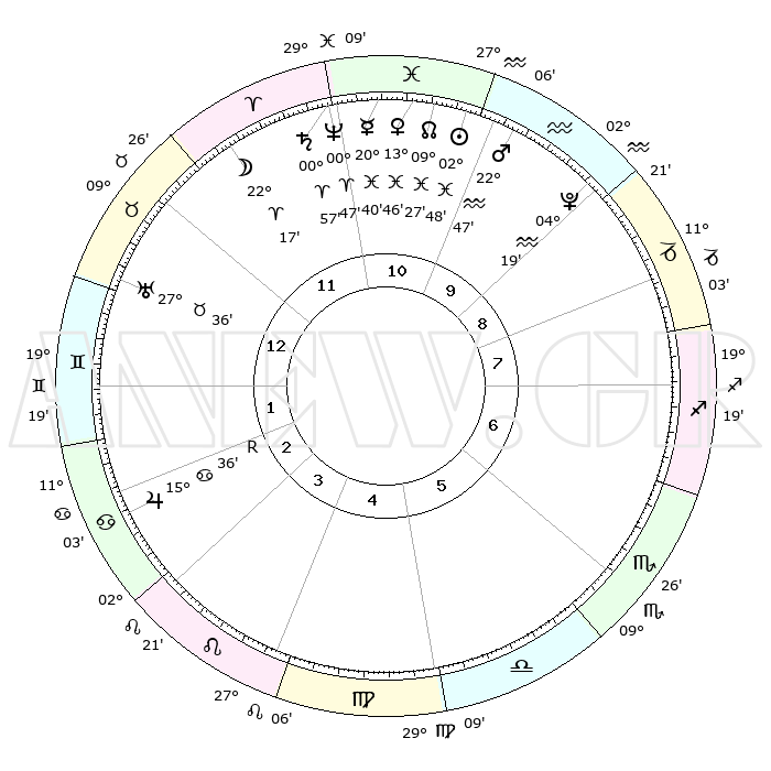 | | ΘΕΣΕΙΣ ΠΛΑΝΗΤΩΝ ΑΣΤΡΟΛΟΓΙΚΟΥ ΧΑΡΤΗ ΤΗΣ ΣΤΙΓΜΗΣ ΑΥΤΗΣ | | | | Πλανήτης | Ζώδιο | Μοίρες | Δεκαήμ. | Σε οίκο | Απόκλιση | | Ακμές των οίκων | | Ηλιος | Ιχθείς | 02°43' | Πρώτο | 11 | 10 S 30 | | 1ος | 14°18' | Ταύρος | | Σελήνη | Κριός | 21°06' | Τρίτο | 12 | 11 N 32 | | 2ος | 12°42' | Δίδυμοι | | Ερμής | Ιχθείς | 20°36' | Τρίτο | 11 | 02 S 15 | | 3ος | 04°60' | Καρκίνος | | Αφροδίτη | Ιχθείς | 13°40' | Δεύτερο | 11 | 07 S 45 | | 4ος | 26°56' | Καρκίνος | | Αρης | Υδροχόος | 22°43' | Τρίτο | 10 | 14 S 58 | | 5ος | 22°60' | Λέων | | Δίας | Καρκίνος | 15°36'R | Δεύτερο | 3 | 22 N 51 | | 6ος | 28°34' | Παρθένος | | Κρόνος | Κριός | 00°56' | Πρώτο | 12 | 01 S 35 | | 7ος | 14°18' | Σκορπιός | | Ουρανός | Ταύρος | 27°35' | Τρίτο | 1 | 19 N 26 | | 8ος | 12°42' | Τοξότης | | Ποσειδώνας | Κριός | 00°47' | Πρώτο | 12 | 00 S 53 | | 9ος | 04°60' | Αιγόκερως | | Πλούτωνας | Υδροχόος | 04°19' | Πρώτο | 10 | 22 S 55 | | 10ος | 26°56' | Αιγόκερως | | Β. Δεσμός | Ιχθείς | 09°27' | Πρώτο | 11 | 08 S 01 | | 11ος | 22°60' | Υδροχόος | | Ωροσκόπος | Ταύρος | 14°18' | Δεύτερο | | | 12ος | 28°34' | Ιχθείς | | Μεσουράνημα | Αιγόκερως | 26°56' | Τρίτο | | | |