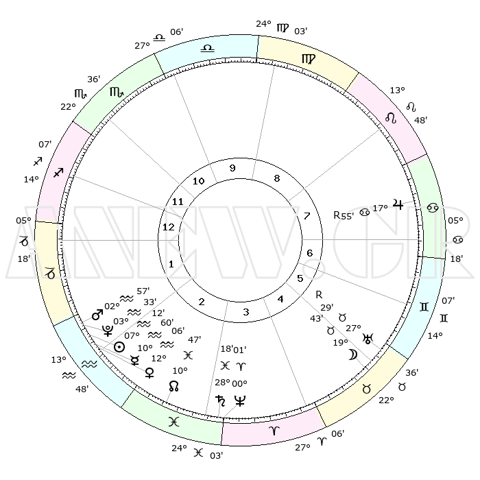 | | ΘΕΣΕΙΣ ΠΛΑΝΗΤΩΝ ΑΣΤΡΟΛΟΓΙΚΟΥ ΧΑΡΤΗ ΤΗΣ ΣΤΙΓΜΗΣ ΑΥΤΗΣ | | | | Πλανήτης | Ζώδιο | Μοίρες | Δεκαήμ. | Σε οίκο | Απόκλιση | | Ακμές των οίκων | | Ηλιος | Υδροχόος | 07°08' | Πρώτο | 2 | 18 S 29 | | 1ος | 14°57' | Τοξότης | | Σελήνη | Ταύρος | 18°49' | Δεύτερο | 5 | 22 N 06 | | 2ος | 18°38' | Αιγόκερως | | Ερμής | Υδροχόος | 10°53' | Δεύτερο | 2 | 19 S 29 | | 3ος | 26°49' | Υδροχόος | | Αφροδίτη | Υδροχόος | 12°01' | Δεύτερο | 2 | 18 S 25 | | 4ος | 02°33' | Κριός | | Αρης | Υδροχόος | 02°54' | Πρώτο | 2 | 20 S 30 | | 5ος | 01°22' | Ταύρος | | Δίας | Καρκίνος | 17°56'R | Δεύτερο | 7 | 22 N 32 | | 6ος | 24°31' | Ταύρος | | Κρόνος | Ιχθείς | 28°17' | Τρίτο | 3 | 02 S 41 | | 7ος | 14°57' | Δίδυμοι | | Ουρανός | Ταύρος | 27°29'R | Τρίτο | 6 | 19 N 24 | | 8ος | 18°38' | Καρκίνος | | Ποσειδώνας | Κριός | 00°01' | Πρώτο | 3 | 01 S 12 | | 9ος | 26°49' | Λέων | | Πλούτωνας | Υδροχόος | 03°33' | Πρώτο | 2 | 23 S 03 | | 10ος | 02°33' | Ζυγός | | Β. Δεσμός | Ιχθείς | 10°47' | Δεύτερο | 3 | 07 S 31 | | 11ος | 01°22' | Σκορπιός | | Ωροσκόπος | Τοξότης | 14°57' | Δεύτερο | | | 12ος | 24°31' | Σκορπιός | | Μεσουράνημα | Ζυγός | 02°33' | Πρώτο | | | |