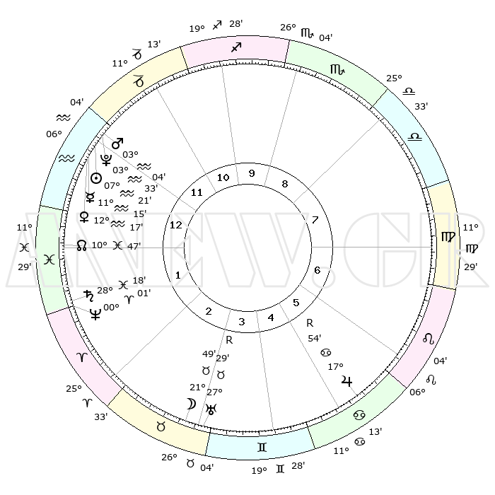 | | ΘΕΣΕΙΣ ΠΛΑΝΗΤΩΝ ΑΣΤΡΟΛΟΓΙΚΟΥ ΧΑΡΤΗ ΤΗΣ ΣΤΙΓΜΗΣ ΑΥΤΗΣ | | | | Πλανήτης | Ζώδιο | Μοίρες | Δεκαήμ. | Σε οίκο | Απόκλιση | | Ακμές των οίκων | | Ηλιος | Υδροχόος | 07°17' | Πρώτο | 1 | 18 S 27 | | 1ος | 02°15' | Υδροχόος | | Σελήνη | Ταύρος | 20°43' | Τρίτο | 3 | 22 N 41 | | 2ος | 16°42' | Ιχθείς | | Ερμής | Υδροχόος | 11°07' | Δεύτερο | 1 | 19 S 25 | | 3ος | 24°47' | Κριός | | Αφροδίτη | Υδροχόος | 12°11' | Δεύτερο | 1 | 18 S 22 | | 4ος | 22°52' | Ταύρος | | Αρης | Υδροχόος | 03°00' | Πρώτο | 1 | 20 S 29 | | 5ος | 15°28' | Δίδυμοι | | Δίας | Καρκίνος | 17°55'R | Δεύτερο | 6 | 22 N 32 | | 6ος | 06°59' | Καρκίνος | | Κρόνος | Ιχθείς | 28°18' | Τρίτο | 2 | 02 S 41 | | 7ος | 02°15' | Λέων | | Ουρανός | Ταύρος | 27°29'R | Τρίτο | 4 | 19 N 24 | | 8ος | 16°42' | Παρθένος | | Ποσειδώνας | Κριός | 00°01' | Πρώτο | 2 | 01 S 12 | | 9ος | 24°47' | Ζυγός | | Πλούτωνας | Υδροχόος | 03°33' | Πρώτο | 1 | 23 S 03 | | 10ος | 22°52' | Σκορπιός | | Β. Δεσμός | Ιχθείς | 10°47' | Δεύτερο | 1 | 07 S 31 | | 11ος | 15°28' | Τοξότης | | Ωροσκόπος | Υδροχόος | 02°15' | Πρώτο | | | 12ος | 06°59' | Αιγόκερως | | Μεσουράνημα | Σκορπιός | 22°52' | Τρίτο | | | |