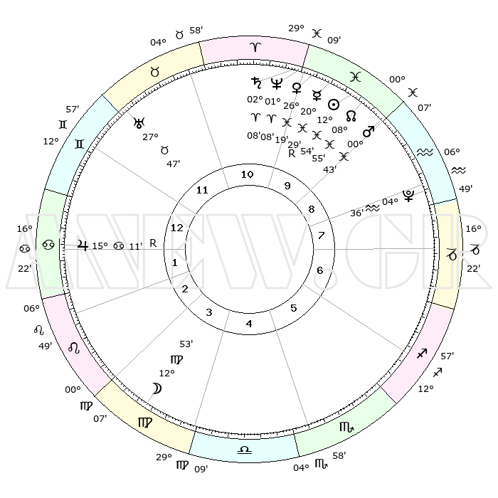 | | ΘΕΣΕΙΣ ΠΛΑΝΗΤΩΝ ΑΣΤΡΟΛΟΓΙΚΟΥ ΧΑΡΤΗ ΤΗΣ ΣΤΙΓΜΗΣ ΑΥΤΗΣ | | | | Πλανήτης | Ζώδιο | Μοίρες | Δεκαήμ. | Σε οίκο | Απόκλιση | | Ακμές των οίκων | | Ηλιος | Ιχθείς | 12°51' | Δεύτερο | 10 | 06 S 44 | | 1ος | 27°50' | Δίδυμοι | | Σελήνη | Παρθένος | 12°07' | Δεύτερο | 4 | 06 N 45 | | 2ος | 18°46' | Καρκίνος | | Ερμής | Ιχθείς | 20°32'R | Τρίτο | 10 | 00 S 27 | | 3ος | 10°26' | Λέων | | Αφροδίτη | Ιχθείς | 26°15' | Τρίτο | 10 | 02 S 42 | | 4ος | 06°25' | Παρθένος | | Αρης | Ιχθείς | 00°40' | Πρώτο | 9 | 12 S 16 | | 5ος | 09°60' | Ζυγός | | Δίας | Καρκίνος | 15°11'R | Δεύτερο | 1 | 22 N 55 | | 6ος | 20°08' | Σκορπιός | | Κρόνος | Κριός | 02°08' | Πρώτο | 10 | 01 S 06 | | 7ος | 27°50' | Τοξότης | | Ουρανός | Ταύρος | 27°47' | Τρίτο | 12 | 19 N 29 | | 8ος | 18°46' | Αιγόκερως | | Ποσειδώνας | Κριός | 01°08' | Πρώτο | 10 | 00 S 45 | | 9ος | 10°26' | Υδροχόος | | Πλούτωνας | Υδροχόος | 04°36' | Πρώτο | 8 | 22 S 52 | | 10ος | 06°25' | Ιχθείς | | Β. Δεσμός | Ιχθείς | 08°55' | Πρώτο | 10 | 08 S 14 | | 11ος | 09°60' | Κριός | | Ωροσκόπος | Δίδυμοι | 27°50' | Τρίτο | | | 12ος | 20°08' | Ταύρος | | Μεσουράνημα | Ιχθείς | 06°25' | Πρώτο | | | |