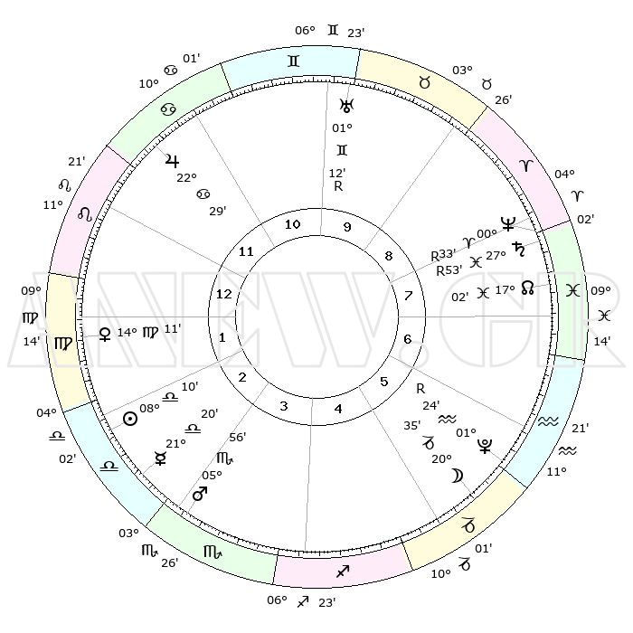 | ΘΕΣΕΙΣ ΠΛΑΝΗΤΩΝ ΑΣΤΡΟΛΟΓΙΚΟΥ ΧΑΡΤΗ ΤΗΣ ΣΤΙΓΜΗΣ ΑΥΤΗΣ | | Πλανήτης | Ζώδιο | Μοίρες | Δεκαήμ. | Σε οίκο | Απόκλιση | | Ακμές των οίκων | Ηλιος | Ζυγός | 08°04' | Πρώτο | 3 | 03 S 12 | | 1ος | 11°36' | Λέων | Σελήνη | Αιγόκερως | 19°24' | Δεύτερο | 6 | 26 S 29 | | 2ος | 03°34' | Παρθένος | Ερμής | Ζυγός | 21°11' | Τρίτο | 3 | 08 S 21 | | 3ος | 00°11' | Ζυγός | Αφροδίτη | Παρθένος | 14°04' | Δεύτερο | 2 | 07 N 27 | | 4ος | 02°22' | Σκορπιός | Αρης | Σκορπιός | 05°52' | Πρώτο | 4 | 13 S 33 | | 5ος | 07°53' | Τοξότης | Δίας | Καρκίνος | 22°28' | Τρίτο | 12 | 21 N 35 | | 6ος | 11°49' | Αιγόκερως | Κρόνος | Ιχθείς | 27°53'R | Τρίτο | 8 | 03 S 09 | | 7ος | 11°36' | Υδροχόος | Ουρανός | Δίδυμοι | 01°12'R | Πρώτο | 10 | 20 N 11 | | 8ος | 03°34' | Ιχθείς | Ποσειδώνας | Κριός | 00°33'R | Πρώτο | 9 | 01 S 03 | | 9ος | 00°11' | Κριός | Πλούτωνας | Υδροχόος | 01°24'R | Πρώτο | 6 | 23 S 32 | | 10ος | 02°22' | Ταύρος | Β. Δεσμός | Ιχθείς | 17°02' | Δεύτερο | 8 | 05 S 07 | | 11ος | 07°53' | Δίδυμοι | Ωροσκόπος | Λέων | 11°36' | Δεύτερο | | | 12ος | 11°49' | Καρκίνος | Μεσουράνημα | Ταύρος | 02°22' | Πρώτο | | | |