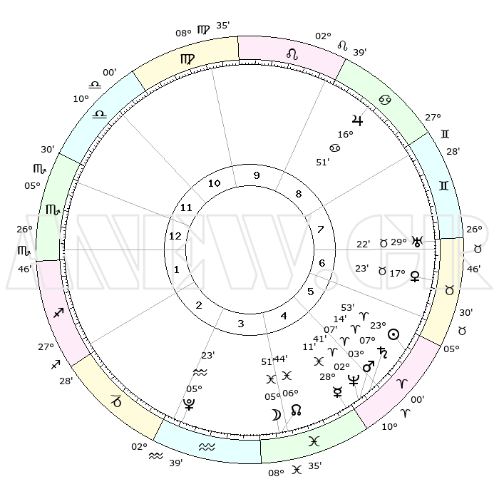 | | ΘΕΣΕΙΣ ΠΛΑΝΗΤΩΝ ΑΣΤΡΟΛΟΓΙΚΟΥ ΧΑΡΤΗ ΤΗΣ ΣΤΙΓΜΗΣ ΑΥΤΗΣ | | | | Πλανήτης | Ζώδιο | Μοίρες | Δεκαήμ. | Σε οίκο | Απόκλιση | | Ακμές των οίκων | | Ηλιος | Κριός | 23°50' | Τρίτο | 6 | 09 N 15 | | 1ος | 09°15' | Σκορπιός | | Σελήνη | Ιχθείς | 05°03' | Πρώτο | 4 | 09 S 55 | | 2ος | 08°17' | Τοξότης | | Ερμής | Ιχθείς | 28°06' | Τρίτο | 5 | 03 S 06 | | 3ος | 11°05' | Αιγόκερως | | Αφροδίτη | Ταύρος | 17°19' | Δεύτερο | 7 | 17 N 06 | | 4ος | 15°57' | Υδροχόος | | Αρης | Κριός | 03°05' | Πρώτο | 5 | 00 N 19 | | 5ος | 18°39' | Ιχθείς | | Δίας | Καρκίνος | 16°50' | Δεύτερο | 9 | 22 N 45 | | 6ος | 16°22' | Κριός | | Κρόνος | Κριός | 07°14' | Πρώτο | 5 | 00 N 54 | | 7ος | 09°15' | Ταύρος | | Ουρανός | Ταύρος | 29°22' | Τρίτο | 7 | 19 N 51 | | 8ος | 08°17' | Δίδυμοι | | Ποσειδώνας | Κριός | 02°41' | Πρώτο | 5 | 00 S 08 | | 9ος | 11°05' | Καρκίνος | | Πλούτωνας | Υδροχόος | 05°23' | Πρώτο | 3 | 22 S 47 | | 10ος | 15°57' | Λέων | | Β. Δεσμός | Ιχθείς | 06°44' | Πρώτο | 4 | 09 S 02 | | 11ος | 18°39' | Παρθένος | | Ωροσκόπος | Σκορπιός | 09°15' | Πρώτο | | | 12ος | 16°22' | Ζυγός | | Μεσουράνημα | Λέων | 15°57' | Δεύτερο | | | |