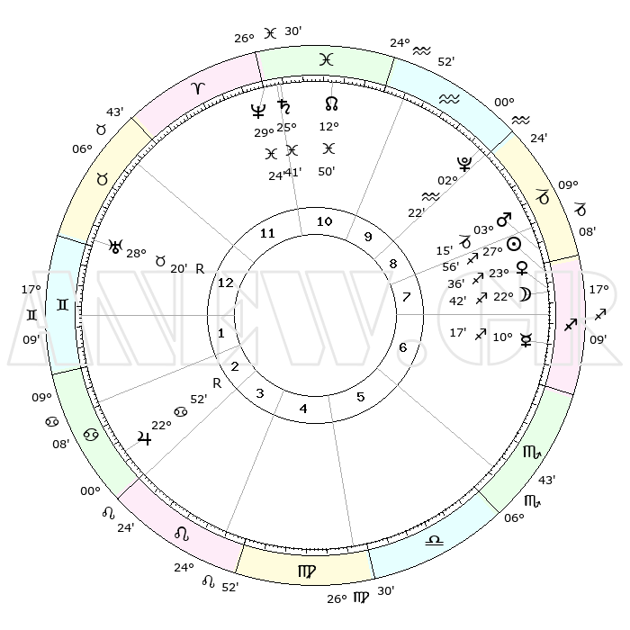 | | ΘΕΣΕΙΣ ΠΛΑΝΗΤΩΝ ΑΣΤΡΟΛΟΓΙΚΟΥ ΧΑΡΤΗ ΤΗΣ ΣΤΙΓΜΗΣ ΑΥΤΗΣ | | | | Πλανήτης | Ζώδιο | Μοίρες | Δεκαήμ. | Σε οίκο | Απόκλιση | | Ακμές των οίκων | | Ηλιος | Τοξότης | 27°25' | Τρίτο | 2 | 23 S 24 | | 1ος | 13°27' | Σκορπιός | | Σελήνη | Τοξότης | 16°37' | Δεύτερο | 2 | 27 S 43 | | 2ος | 12°48' | Τοξότης | | Ερμής | Τοξότης | 09°34' | Πρώτο | 1 | 20 S 53 | | 3ος | 16°06' | Αιγόκερως | | Αφροδίτη | Τοξότης | 22°58' | Τρίτο | 2 | 23 S 15 | | 4ος | 21°16' | Υδροχόος | | Αρης | Αιγόκερως | 02°52' | Πρώτο | 2 | 24 S 12 | | 5ος | 23°46' | Ιχθείς | | Δίας | Καρκίνος | 22°56'R | Τρίτο | 9 | 21 N 41 | | 6ος | 21°00' | Κριός | | Κρόνος | Ιχθείς | 25°40' | Τρίτο | 5 | 03 S 50 | | 7ος | 13°27' | Ταύρος | | Ουρανός | Ταύρος | 28°21'R | Τρίτο | 7 | 19 N 35 | | 8ος | 12°48' | Δίδυμοι | | Ποσειδώνας | Ιχθείς | 29°24' | Τρίτο | 5 | 01 S 28 | | 9ος | 16°06' | Καρκίνος | | Πλούτωνας | Υδροχόος | 02°21' | Πρώτο | 3 | 23 S 18 | | 10ος | 21°16' | Λέων | | Β. Δεσμός | Ιχθείς | 12°51' | Δεύτερο | 4 | 06 S 44 | | 11ος | 23°46' | Παρθένος | | Ωροσκόπος | Σκορπιός | 13°27' | Δεύτερο | | | 12ος | 21°00' | Ζυγός | | Μεσουράνημα | Λέων | 21°16' | Τρίτο | | | |