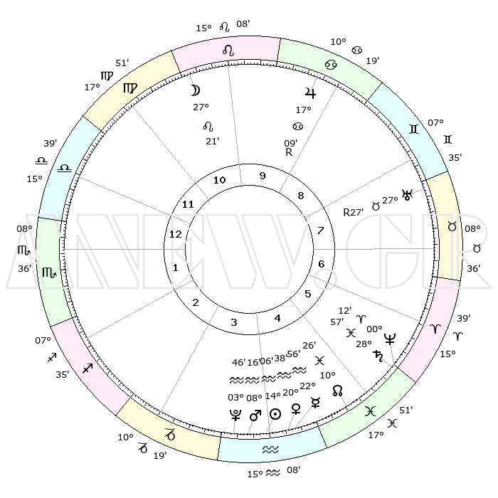 | | ΘΕΣΕΙΣ ΠΛΑΝΗΤΩΝ ΑΣΤΡΟΛΟΓΙΚΟΥ ΧΑΡΤΗ ΤΗΣ ΣΤΙΓΜΗΣ ΑΥΤΗΣ | | | | Πλανήτης | Ζώδιο | Μοίρες | Δεκαήμ. | Σε οίκο | Απόκλιση | | Ακμές των οίκων | | Ηλιος | Υδροχόος | 13°33' | Δεύτερο | 10 | 16 S 45 | | 1ος | 13°23' | Ταύρος | | Σελήνη | Λέων | 19°41' | Δεύτερο | 4 | 16 N 33 | | 2ος | 12°01' | Δίδυμοι | | Ερμής | Υδροχόος | 21°57' | Τρίτο | 10 | 15 S 53 | | 3ος | 04°23' | Καρκίνος | | Αφροδίτη | Υδροχόος | 19°56' | Δεύτερο | 10 | 16 S 08 | | 4ος | 26°18' | Καρκίνος | | Αρης | Υδροχόος | 07°50' | Πρώτο | 10 | 19 S 19 | | 5ος | 22°14' | Λέων | | Δίας | Καρκίνος | 17°12'R | Δεύτερο | 3 | 22 N 38 | | 6ος | 27°37' | Παρθένος | | Κρόνος | Ιχθείς | 28°54' | Τρίτο | 12 | 02 S 26 | | 7ος | 13°23' | Σκορπιός | | Ουρανός | Ταύρος | 27°27'R | Τρίτο | 1 | 19 N 24 | | 8ος | 12°01' | Τοξότης | | Ποσειδώνας | Κριός | 00°11' | Πρώτο | 12 | 01 S 08 | | 9ος | 04°23' | Αιγόκερως | | Πλούτωνας | Υδροχόος | 03°45' | Πρώτο | 10 | 23 S 01 | | 10ος | 26°18' | Αιγόκερως | | Β. Δεσμός | Ιχθείς | 10°27' | Δεύτερο | 11 | 07 S 39 | | 11ος | 22°14' | Υδροχόος | | Ωροσκόπος | Ταύρος | 13°23' | Δεύτερο | | | 12ος | 27°37' | Ιχθείς | | Μεσουράνημα | Αιγόκερως | 26°18' | Τρίτο | | | |
