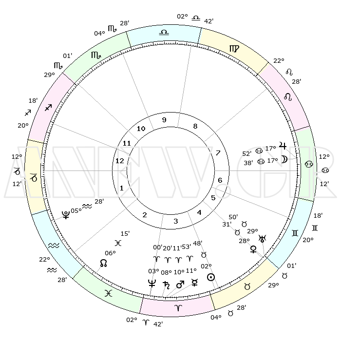 | | ΘΕΣΕΙΣ ΠΛΑΝΗΤΩΝ ΑΣΤΡΟΛΟΓΙΚΟΥ ΧΑΡΤΗ ΤΗΣ ΣΤΙΓΜΗΣ ΑΥΤΗΣ | | | | Πλανήτης | Ζώδιο | Μοίρες | Δεκαήμ. | Σε οίκο | Απόκλιση | | Ακμές των οίκων | | Ηλιος | Ταύρος | 01°15' | Πρώτο | 10 | 11 N 54 | | 1ος | 15°02' | Καρκίνος | | Σελήνη | Δίδυμοι | 24°42' | Τρίτο | 12 | 28 N 12 | | 2ος | 05°27' | Λέων | | Ερμής | Κριός | 09°19' | Πρώτο | 10 | 01 N 18 | | 3ος | 28°37' | Λέων | | Αφροδίτη | Ταύρος | 26°35' | Τρίτο | 11 | 19 N 50 | | 4ος | 27°25' | Παρθένος | | Αρης | Κριός | 08°57' | Πρώτο | 10 | 02 N 41 | | 5ος | 03°09' | Σκορπιός | | Δίας | Καρκίνος | 17°40' | Δεύτερο | 1 | 22 N 39 | | 6ος | 11°21' | Τοξότης | | Κρόνος | Κριός | 08°09' | Πρώτο | 10 | 01 N 15 | | 7ος | 15°01' | Αιγόκερως | | Ουρανός | Ταύρος | 29°45' | Τρίτο | 11 | 19 N 56 | | 8ος | 05°27' | Υδροχόος | | Ποσειδώνας | Κριός | 02°57' | Πρώτο | 10 | 00 S 02 | | 9ος | 28°37' | Υδροχόος | | Πλούτωνας | Υδροχόος | 05°27' | Πρώτο | 7 | 22 S 48 | | 10ος | 27°25' | Ιχθείς | | Β. Δεσμός | Ιχθείς | 06°20' | Πρώτο | 9 | 09 S 11 | | 11ος | 03°09' | Ταύρος | | Ωροσκόπος | Καρκίνος | 15°02' | Δεύτερο | | | 12ος | 11°21' | Δίδυμοι | | Μεσουράνημα | Ιχθείς | 27°25' | Τρίτο | | | |