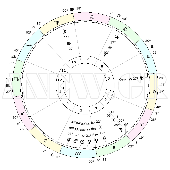 | | ΘΕΣΕΙΣ ΠΛΑΝΗΤΩΝ ΑΣΤΡΟΛΟΓΙΚΟΥ ΧΑΡΤΗ ΤΗΣ ΣΤΙΓΜΗΣ ΑΥΤΗΣ | | | | Πλανήτης | Ζώδιο | Μοίρες | Δεκαήμ. | Σε οίκο | Απόκλιση | | Ακμές των οίκων | | Ηλιος | Υδροχόος | 15°06' | Δεύτερο | 4 | 16 S 18 | | 1ος | 05°46' | Σκορπιός | | Σελήνη | Παρθένος | 10°47' | Δεύτερο | 10 | 07 N 23 | | 2ος | 04°33' | Τοξότης | | Ερμής | Υδροχόος | 24°41' | Τρίτο | 4 | 14 S 51 | | 3ος | 07°01' | Αιγόκερως | | Αφροδίτη | Υδροχόος | 21°52' | Τρίτο | 4 | 15 S 32 | | 4ος | 11°37' | Υδροχόος | | Αρης | Υδροχόος | 09°02' | Πρώτο | 3 | 19 S 00 | | 5ος | 14°25' | Ιχθείς | | Δίας | Καρκίνος | 17°02'R | Δεύτερο | 9 | 22 N 39 | | 6ος | 12°32' | Κριός | | Κρόνος | Ιχθείς | 29°03' | Τρίτο | 5 | 02 S 22 | | 7ος | 05°46' | Ταύρος | | Ουρανός | Ταύρος | 27°27'R | Τρίτο | 7 | 19 N 24 | | 8ος | 04°33' | Δίδυμοι | | Ποσειδώνας | Κριός | 00°14' | Πρώτο | 5 | 01 S 07 | | 9ος | 07°01' | Καρκίνος | | Πλούτωνας | Υδροχόος | 03°48' | Πρώτο | 3 | 23 S 00 | | 10ος | 11°37' | Λέων | | Β. Δεσμός | Ιχθείς | 10°22' | Δεύτερο | 4 | 07 S 41 | | 11ος | 14°25' | Παρθένος | | Ωροσκόπος | Σκορπιός | 05°46' | Πρώτο | | | 12ος | 12°32' | Ζυγός | | Μεσουράνημα | Λέων | 11°37' | Δεύτερο | | | |