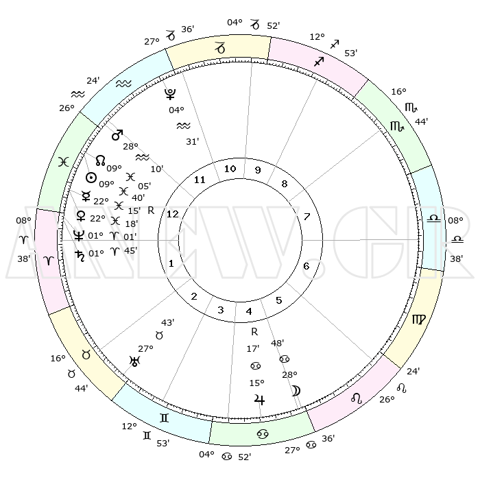 | | ΘΕΣΕΙΣ ΠΛΑΝΗΤΩΝ ΑΣΤΡΟΛΟΓΙΚΟΥ ΧΑΡΤΗ ΤΗΣ ΣΤΙΓΜΗΣ ΑΥΤΗΣ | | | | Πλανήτης | Ζώδιο | Μοίρες | Δεκαήμ. | Σε οίκο | Απόκλιση | | Ακμές των οίκων | | Ηλιος | Ιχθείς | 10°07' | Δεύτερο | 6 | 07 S 46 | | 1ος | 19°35' | Παρθένος | | Σελήνη | Λέων | 05°04' | Πρώτο | 11 | 21 N 52 | | 2ος | 15°20' | Ζυγός | | Ερμής | Ιχθείς | 22°06'R | Τρίτο | 7 | 00 S 09 | | 3ος | 15°20' | Σκορπιός | | Αφροδίτη | Ιχθείς | 22°52' | Τρίτο | 7 | 04 S 05 | | 4ος | 18°16' | Τοξότης | | Αρης | Υδροχόος | 28°31' | Τρίτο | 6 | 13 S 01 | | 5ος | 21°27' | Αιγόκερως | | Δίας | Καρκίνος | 15°16'R | Δεύτερο | 10 | 22 N 54 | | 6ος | 22°18' | Υδροχόος | | Κρόνος | Κριός | 01°48' | Πρώτο | 7 | 01 S 14 | | 7ος | 19°35' | Ιχθείς | | Ουρανός | Ταύρος | 27°44' | Τρίτο | 9 | 19 N 28 | | 8ος | 15°20' | Κριός | | Ποσειδώνας | Κριός | 01°02' | Πρώτο | 7 | 00 S 47 | | 9ος | 15°20' | Ταύρος | | Πλούτωνας | Υδροχόος | 04°32' | Πρώτο | 5 | 22 S 53 | | 10ος | 18°16' | Δίδυμοι | | Β. Δεσμός | Ιχθείς | 09°04' | Πρώτο | 6 | 08 S 10 | | 11ος | 21°27' | Καρκίνος | | Ωροσκόπος | Παρθένος | 19°35' | Δεύτερο | | | 12ος | 22°18' | Λέων | | Μεσουράνημα | Δίδυμοι | 18°16' | Δεύτερο | | | |