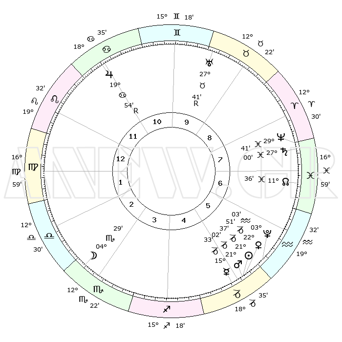 | | ΘΕΣΕΙΣ ΠΛΑΝΗΤΩΝ ΑΣΤΡΟΛΟΓΙΚΟΥ ΧΑΡΤΗ ΤΗΣ ΣΤΙΓΜΗΣ ΑΥΤΗΣ | | | | Πλανήτης | Ζώδιο | Μοίρες | Δεκαήμ. | Σε οίκο | Απόκλιση | | Ακμές των οίκων | | Ηλιος | Αιγόκερως | 21°21' | Τρίτο | 7 | 21 S 44 | | 1ος | 02°18' | Καρκίνος | | Σελήνη | Σκορπιός | 01°29' | Πρώτο | 5 | 15 S 44 | | 2ος | 22°58' | Καρκίνος | | Ερμής | Αιγόκερως | 15°09' | Δεύτερο | 7 | 24 S 07 | | 3ος | 14°56' | Λέων | | Αφροδίτη | Αιγόκερως | 22°32' | Τρίτο | 7 | 22 S 25 | | 4ος | 11°37' | Παρθένος | | Αρης | Αιγόκερως | 20°50' | Τρίτο | 7 | 22 S 46 | | 5ος | 15°55' | Ζυγός | | Δίας | Καρκίνος | 19°56'R | Δεύτερο | 1 | 22 N 13 | | 6ος | 25°44' | Σκορπιός | | Κρόνος | Ιχθείς | 26°59' | Τρίτο | 10 | 03 S 15 | | 7ος | 02°18' | Αιγόκερως | | Ουρανός | Ταύρος | 27°42'R | Τρίτο | 12 | 19 N 27 | | 8ος | 22°58' | Αιγόκερως | | Ποσειδώνας | Ιχθείς | 29°40' | Τρίτο | 10 | 01 S 21 | | 9ος | 14°56' | Υδροχόος | | Πλούτωνας | Υδροχόος | 03°03' | Πρώτο | 8 | 23 S 09 | | 10ος | 11°37' | Ιχθείς | | Β. Δεσμός | Ιχθείς | 11°37' | Δεύτερο | 9 | 07 S 12 | | 11ος | 15°55' | Κριός | | Ωροσκόπος | Καρκίνος | 02°18' | Πρώτο | | | 12ος | 25°44' | Ταύρος | | Μεσουράνημα | Ιχθείς | 11°37' | Δεύτερο | | | |