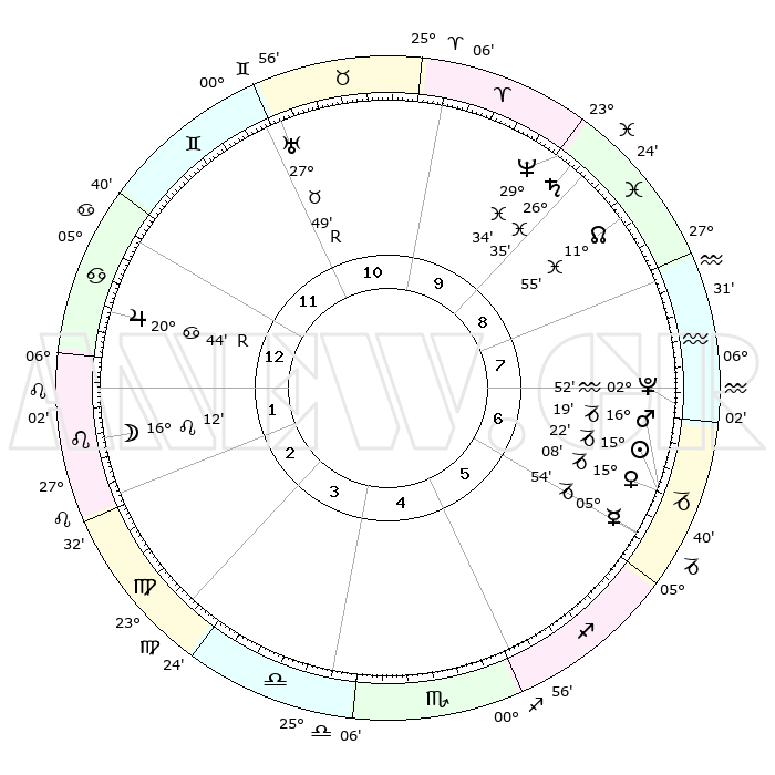| | ΘΕΣΕΙΣ ΠΛΑΝΗΤΩΝ ΑΣΤΡΟΛΟΓΙΚΟΥ ΧΑΡΤΗ ΤΗΣ ΣΤΙΓΜΗΣ ΑΥΤΗΣ | | | | Πλανήτης | Ζώδιο | Μοίρες | Δεκαήμ. | Σε οίκο | Απόκλιση | | Ακμές των οίκων | | Ηλιος | Αιγόκερως | 14°44' | Δεύτερο | 2 | 22 S 37 | | 1ος | 26°43' | Σκορπιός | | Σελήνη | Λέων | 07°26' | Πρώτο | 9 | 21 N 05 | | 2ος | 27°25' | Τοξότης | | Ερμής | Αιγόκερως | 04°57' | Πρώτο | 2 | 24 S 20 | | 3ος | 02°35' | Υδροχόος | | Αφροδίτη | Αιγόκερως | 14°22' | Δεύτερο | 2 | 23 S 19 | | 4ος | 08°31' | Ιχθείς | | Αρης | Αιγόκερως | 15°50' | Δεύτερο | 2 | 23 S 24 | | 5ος | 09°57' | Κριός | | Δίας | Καρκίνος | 20°49'R | Τρίτο | 8 | 22 N 04 | | 6ος | 05°26' | Ταύρος | | Κρόνος | Ιχθείς | 26°32' | Τρίτο | 4 | 03 S 26 | | 7ος | 26°43' | Ταύρος | | Ουρανός | Ταύρος | 27°50'R | Τρίτο | 7 | 19 N 29 | | 8ος | 27°25' | Δίδυμοι | | Ποσειδώνας | Ιχθείς | 29°34' | Τρίτο | 4 | 01 S 24 | | 9ος | 02°35' | Λέων | | Πλούτωνας | Υδροχόος | 02°51' | Πρώτο | 3 | 23 S 12 | | 10ος | 08°31' | Παρθένος | | Β. Δεσμός | Ιχθείς | 11°57' | Δεύτερο | 4 | 07 S 05 | | 11ος | 09°57' | Ζυγός | | Ωροσκόπος | Σκορπιός | 26°43' | Τρίτο | | | 12ος | 05°26' | Σκορπιός | | Μεσουράνημα | Παρθένος | 08°31' | Πρώτο | | | |