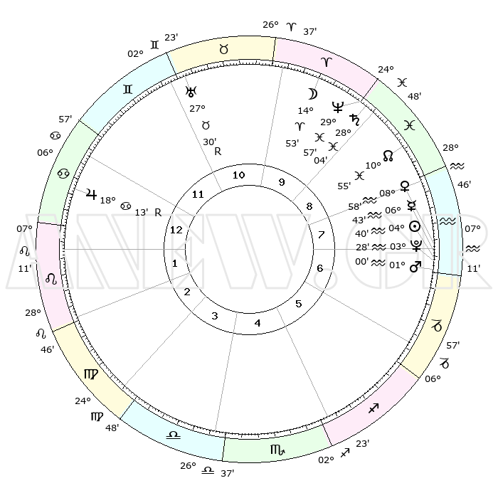 | | ΘΕΣΕΙΣ ΠΛΑΝΗΤΩΝ ΑΣΤΡΟΛΟΓΙΚΟΥ ΧΑΡΤΗ ΤΗΣ ΣΤΙΓΜΗΣ ΑΥΤΗΣ | | | | Πλανήτης | Ζώδιο | Μοίρες | Δεκαήμ. | Σε οίκο | Απόκλιση | | Ακμές των οίκων | | Ηλιος | Υδροχόος | 04°36' | Πρώτο | 7 | 19 S 06 | | 1ος | 16°29' | Καρκίνος | | Σελήνη | Κριός | 13°55' | Δεύτερο | 10 | 08 N 13 | | 2ος | 06°57' | Λέων | | Ερμής | Υδροχόος | 06°36' | Πρώτο | 7 | 20 S 38 | | 3ος | 00°16' | Παρθένος | | Αφροδίτη | Υδροχόος | 08°53' | Πρώτο | 8 | 19 S 13 | | 4ος | 29°19' | Παρθένος | | Αρης | Υδροχόος | 00°57' | Πρώτο | 7 | 20 S 56 | | 5ος | 05°08' | Σκορπιός | | Δίας | Καρκίνος | 18°14'R | Δεύτερο | 1 | 22 N 29 | | 6ος | 13°06' | Τοξότης | | Κρόνος | Ιχθείς | 28°03' | Τρίτο | 9 | 02 S 47 | | 7ος | 16°29' | Αιγόκερως | | Ουρανός | Ταύρος | 27°30'R | Τρίτο | 11 | 19 N 25 | | 8ος | 06°57' | Υδροχόος | | Ποσειδώνας | Ιχθείς | 29°57' | Τρίτο | 10 | 01 S 14 | | 9ος | 00°16' | Ιχθείς | | Πλούτωνας | Υδροχόος | 03°28' | Πρώτο | 7 | 23 S 04 | | 10ος | 29°19' | Ιχθείς | | Β. Δεσμός | Ιχθείς | 10°55' | Δεύτερο | 9 | 07 S 28 | | 11ος | 05°08' | Ταύρος | | Ωροσκόπος | Καρκίνος | 16°29' | Δεύτερο | | | 12ος | 13°06' | Δίδυμοι | | Μεσουράνημα | Ιχθείς | 29°19' | Τρίτο | | | |