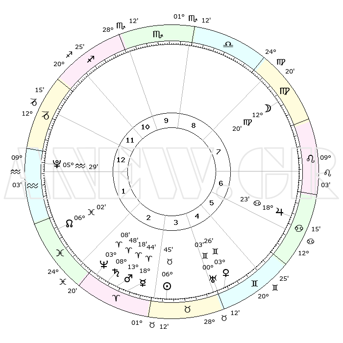 | | ΘΕΣΕΙΣ ΠΛΑΝΗΤΩΝ ΑΣΤΡΟΛΟΓΙΚΟΥ ΧΑΡΤΗ ΤΗΣ ΣΤΙΓΜΗΣ ΑΥΤΗΣ | | | | Πλανήτης | Ζώδιο | Μοίρες | Δεκαήμ. | Σε οίκο | Απόκλιση | | Ακμές των οίκων | | Ηλιος | Ταύρος | 05°50' | Πρώτο | 2 | 13 N 28 | | 1ος | 07°32' | Ιχθείς | | Σελήνη | Παρθένος | 00°04' | Πρώτο | 6 | 12 N 03 | | 2ος | 22°10' | Κριός | | Ερμής | Κριός | 17°06' | Δεύτερο | 1 | 04 N 32 | | 3ος | 23°25' | Ταύρος | | Αφροδίτη | Δίδυμοι | 02°18' | Πρώτο | 3 | 21 N 17 | | 4ος | 17°08' | Δίδυμοι | | Αρης | Κριός | 12°35' | Δεύτερο | 1 | 04 N 07 | | 5ος | 08°50' | Καρκίνος | | Δίας | Καρκίνος | 18°15' | Δεύτερο | 5 | 22 N 34 | | 6ος | 03°13' | Λέων | | Κρόνος | Κριός | 08°42' | Πρώτο | 1 | 01 N 27 | | 7ος | 07°32' | Παρθένος | | Ουρανός | Δίδυμοι | 00°00' | Πρώτο | 3 | 19 N 59 | | 8ος | 22°10' | Ζυγός | | Ποσειδώνας | Κριός | 03°06' | Πρώτο | 1 | 00 N 02 | | 9ος | 23°25' | Σκορπιός | | Πλούτωνας | Υδροχόος | 05°29' | Πρώτο | 12 | 22 S 48 | | 10ος | 17°08' | Τοξότης | | Β. Δεσμός | Ιχθείς | 06°05' | Πρώτο | 12 | 09 S 17 | | 11ος | 08°50' | Αιγόκερως | | Ωροσκόπος | Ιχθείς | 07°32' | Πρώτο | | | 12ος | 03°13' | Υδροχόος | | Μεσουράνημα | Τοξότης | 17°08' | Δεύτερο | | | |