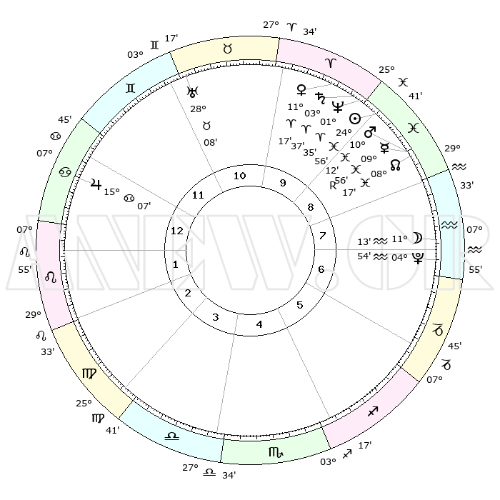 | | ΘΕΣΕΙΣ ΠΛΑΝΗΤΩΝ ΑΣΤΡΟΛΟΓΙΚΟΥ ΧΑΡΤΗ ΤΗΣ ΣΤΙΓΜΗΣ ΑΥΤΗΣ | | | | Πλανήτης | Ζώδιο | Μοίρες | Δεκαήμ. | Σε οίκο | Απόκλιση | | Ακμές των οίκων | | Ηλιος | Ιχθείς | 24°53' | Τρίτο | 9 | 02 S 02 | | 1ος | 19°33' | Καρκίνος | | Σελήνη | Υδροχόος | 10°25' | Δεύτερο | 8 | 20 S 03 | | 2ος | 10°04' | Λέων | | Ερμής | Ιχθείς | 09°58'R | Πρώτο | 9 | 05 S 41 | | 3ος | 03°46' | Παρθένος | | Αφροδίτη | Κριός | 11°13' | Δεύτερο | 10 | 03 N 29 | | 4ος | 03°18' | Ζυγός | | Αρης | Ιχθείς | 10°09' | Δεύτερο | 9 | 08 S 46 | | 5ος | 09°16' | Σκορπιός | | Δίας | Καρκίνος | 15°07' | Δεύτερο | 12 | 22 N 56 | | 6ος | 16°44' | Τοξότης | | Κρόνος | Κριός | 03°36' | Πρώτο | 10 | 00 S 31 | | 7ος | 19°33' | Αιγόκερως | | Ουρανός | Ταύρος | 28°08' | Τρίτο | 11 | 19 N 34 | | 8ος | 10°04' | Υδροχόος | | Ποσειδώνας | Κριός | 01°35' | Πρώτο | 9 | 00 S 34 | | 9ος | 03°46' | Ιχθείς | | Πλούτωνας | Υδροχόος | 04°54' | Πρώτο | 7 | 22 S 49 | | 10ος | 03°18' | Κριός | | Β. Δεσμός | Ιχθείς | 08°17' | Πρώτο | 9 | 08 S 28 | | 11ος | 09°16' | Ταύρος | | Ωροσκόπος | Καρκίνος | 19°33' | Δεύτερο | | | 12ος | 16°44' | Δίδυμοι | | Μεσουράνημα | Κριός | 03°18' | Πρώτο | | | |