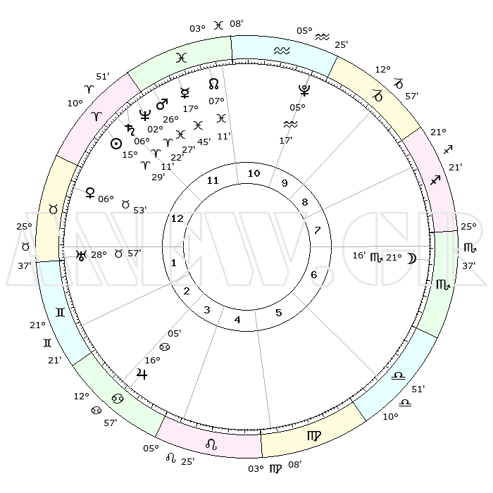 | | ΘΕΣΕΙΣ ΠΛΑΝΗΤΩΝ ΑΣΤΡΟΛΟΓΙΚΟΥ ΧΑΡΤΗ ΤΗΣ ΣΤΙΓΜΗΣ ΑΥΤΗΣ | | | | Πλανήτης | Ζώδιο | Μοίρες | Δεκαήμ. | Σε οίκο | Απόκλιση | | Ακμές των οίκων | | Ηλιος | Κριός | 15°43' | Δεύτερο | 9 | 06 N 11 | | 1ος | 16°28' | Λέων | | Σελήνη | Σκορπιός | 24°13' | Τρίτο | 4 | 23 S 40 | | 2ος | 08°55' | Παρθένος | | Ερμής | Ιχθείς | 18°01' | Δεύτερο | 8 | 06 S 30 | | 3ος | 06°08' | Ζυγός | | Αφροδίτη | Ταύρος | 07°11' | Πρώτο | 9 | 13 N 40 | | 4ος | 08°39' | Σκορπιός | | Αρης | Ιχθείς | 26°39' | Τρίτο | 8 | 02 S 17 | | 5ος | 13°49' | Τοξότης | | Δίας | Καρκίνος | 16°06' | Δεύτερο | 11 | 22 N 50 | | 6ος | 17°07' | Αιγόκερως | | Κρόνος | Κριός | 06°13' | Πρώτο | 9 | 00 N 31 | | 7ος | 16°28' | Υδροχόος | | Ουρανός | Ταύρος | 28°58' | Τρίτο | 10 | 19 N 45 | | 8ος | 08°55' | Ιχθείς | | Ποσειδώνας | Κριός | 02°23' | Πρώτο | 8 | 00 S 15 | | 9ος | 06°08' | Κριός | | Πλούτωνας | Υδροχόος | 05°17' | Πρώτο | 6 | 22 S 47 | | 10ος | 08°39' | Ταύρος | | Β. Δεσμός | Ιχθείς | 07°10' | Πρώτο | 7 | 08 S 53 | | 11ος | 13°49' | Δίδυμοι | | Ωροσκόπος | Λέων | 16°28' | Δεύτερο | | | 12ος | 17°07' | Καρκίνος | | Μεσουράνημα | Ταύρος | 08°39' | Πρώτο | | | |