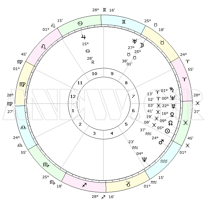 | | ΘΕΣΕΙΣ ΠΛΑΝΗΤΩΝ ΑΣΤΡΟΛΟΓΙΚΟΥ ΧΑΡΤΗ ΤΗΣ ΣΤΙΓΜΗΣ ΑΥΤΗΣ | | | | Πλανήτης | Ζώδιο | Μοίρες | Δεκαήμ. | Σε οίκο | Απόκλιση | | Ακμές των οίκων | | Ηλιος | Ιχθείς | 05°04' | Πρώτο | 6 | 09 S 39 | | 1ος | 06°12' | Παρθένος | | Σελήνη | Ταύρος | 23°56' | Τρίτο | 9 | 23 N 41 | | 2ος | 00°42' | Ζυγός | | Ερμής | Ιχθείς | 22°01' | Τρίτο | 7 | 01 S 10 | | 3ος | 29°53' | Ζυγός | | Αφροδίτη | Ιχθείς | 16°35' | Δεύτερο | 7 | 06 S 36 | | 4ος | 02°50' | Τοξότης | | Αρης | Υδροχόος | 24°34' | Τρίτο | 6 | 14 S 22 | | 5ος | 06°38' | Αιγόκερως | | Δίας | Καρκίνος | 15°28'R | Δεύτερο | 11 | 22 N 52 | | 6ος | 08°09' | Υδροχόος | | Κρόνος | Κριός | 01°13' | Πρώτο | 8 | 01 S 29 | | 7ος | 06°12' | Ιχθείς | | Ουρανός | Ταύρος | 27°38' | Τρίτο | 9 | 19 N 27 | | 8ος | 00°42' | Κριός | | Ποσειδώνας | Κριός | 00°52' | Πρώτο | 8 | 00 S 51 | | 9ος | 29°53' | Κριός | | Πλούτωνας | Υδροχόος | 04°23' | Πρώτο | 5 | 22 S 54 | | 10ος | 02°50' | Δίδυμοι | | Β. Δεσμός | Ιχθείς | 09°20' | Πρώτο | 7 | 08 S 04 | | 11ος | 06°38' | Καρκίνος | | Ωροσκόπος | Παρθένος | 06°12' | Πρώτο | | | 12ος | 08°09' | Λέων | | Μεσουράνημα | Δίδυμοι | 02°50' | Πρώτο | | | |