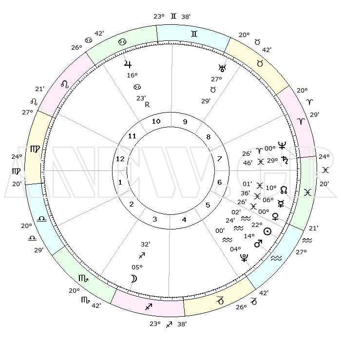 | | ΘΕΣΕΙΣ ΠΛΑΝΗΤΩΝ ΑΣΤΡΟΛΟΓΙΚΟΥ ΧΑΡΤΗ ΤΗΣ ΣΤΙΓΜΗΣ ΑΥΤΗΣ | | | | Πλανήτης | Ζώδιο | Μοίρες | Δεκαήμ. | Σε οίκο | Απόκλιση | | Ακμές των οίκων | | Ηλιος | Υδροχόος | 21°59' | Τρίτο | 6 | 14 S 11 | | 1ος | 08°25' | Παρθένος | | Σελήνη | Τοξότης | 04°54' | Πρώτο | 3 | 26 S 16 | | 2ος | 03°08' | Ζυγός | | Ερμής | Ιχθείς | 06°30' | Πρώτο | 6 | 09 S 51 | | 3ος | 02°28' | Σκορπιός | | Αφροδίτη | Ιχθείς | 00°22' | Πρώτο | 6 | 12 S 42 | | 4ος | 05°26' | Τοξότης | | Αρης | Υδροχόος | 14°22' | Δεύτερο | 6 | 17 S 33 | | 5ος | 09°06' | Αιγόκερως | | Δίας | Καρκίνος | 16°23'R | Δεύτερο | 11 | 22 N 45 | | 6ος | 10°29' | Υδροχόος | | Κρόνος | Ιχθείς | 29°45' | Τρίτο | 7 | 02 S 04 | | 7ος | 08°25' | Ιχθείς | | Ουρανός | Ταύρος | 27°29' | Τρίτο | 9 | 19 N 25 | | 8ος | 03°08' | Κριός | | Ποσειδώνας | Κριός | 00°26' | Πρώτο | 7 | 01 S 02 | | 9ος | 02°28' | Ταύρος | | Πλούτωνας | Υδροχόος | 04°00' | Πρώτο | 5 | 22 S 58 | | 10ος | 05°25' | Δίδυμοι | | Β. Δεσμός | Ιχθείς | 10°01' | Δεύτερο | 7 | 07 S 49 | | 11ος | 09°06' | Καρκίνος | | Ωροσκόπος | Παρθένος | 08°25' | Πρώτο | | | 12ος | 10°29' | Λέων | | Μεσουράνημα | Δίδυμοι | 05°25' | Πρώτο | | | |