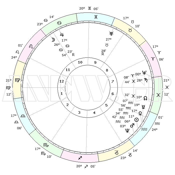 | | ΘΕΣΕΙΣ ΠΛΑΝΗΤΩΝ ΑΣΤΡΟΛΟΓΙΚΟΥ ΧΑΡΤΗ ΤΗΣ ΣΤΙΓΜΗΣ ΑΥΤΗΣ | | | | Πλανήτης | Ζώδιο | Μοίρες | Δεκαήμ. | Σε οίκο | Απόκλιση | | Ακμές των οίκων | | Ηλιος | Υδροχόος | 11°51' | Δεύτερο | 6 | 17 S 14 | | 1ος | 00°51' | Παρθένος | | Σελήνη | Καρκίνος | 25°54' | Τρίτο | 11 | 24 N 28 | | 2ος | 24°47' | Παρθένος | | Ερμής | Υδροχόος | 18°60' | Δεύτερο | 6 | 16 S 56 | | 3ος | 23°32' | Ζυγός | | Αφροδίτη | Υδροχόος | 17°50' | Δεύτερο | 6 | 16 S 46 | | 4ος | 26°28' | Σκορπιός | | Αρης | Υδροχόος | 06°31' | Πρώτο | 6 | 19 S 39 | | 5ος | 00°36' | Αιγόκερως | | Δίας | Καρκίνος | 17°23'R | Δεύτερο | 11 | 22 N 36 | | 6ος | 02°29' | Υδροχόος | | Κρόνος | Ιχθείς | 28°44' | Τρίτο | 8 | 02 S 30 | | 7ος | 00°51' | Ιχθείς | | Ουρανός | Ταύρος | 27°28'R | Τρίτο | 10 | 19 N 24 | | 8ος | 24°47' | Ιχθείς | | Ποσειδώνας | Κριός | 00°08' | Πρώτο | 8 | 01 S 09 | | 9ος | 23°32' | Κριός | | Πλούτωνας | Υδροχόος | 03°42' | Πρώτο | 6 | 23 S 01 | | 10ος | 26°28' | Ταύρος | | Β. Δεσμός | Ιχθείς | 10°33' | Δεύτερο | 7 | 07 S 37 | | 11ος | 00°36' | Καρκίνος | | Ωροσκόπος | Παρθένος | 00°51' | Πρώτο | | | 12ος | 02°29' | Λέων | | Μεσουράνημα | Ταύρος | 26°28' | Τρίτο | | | |