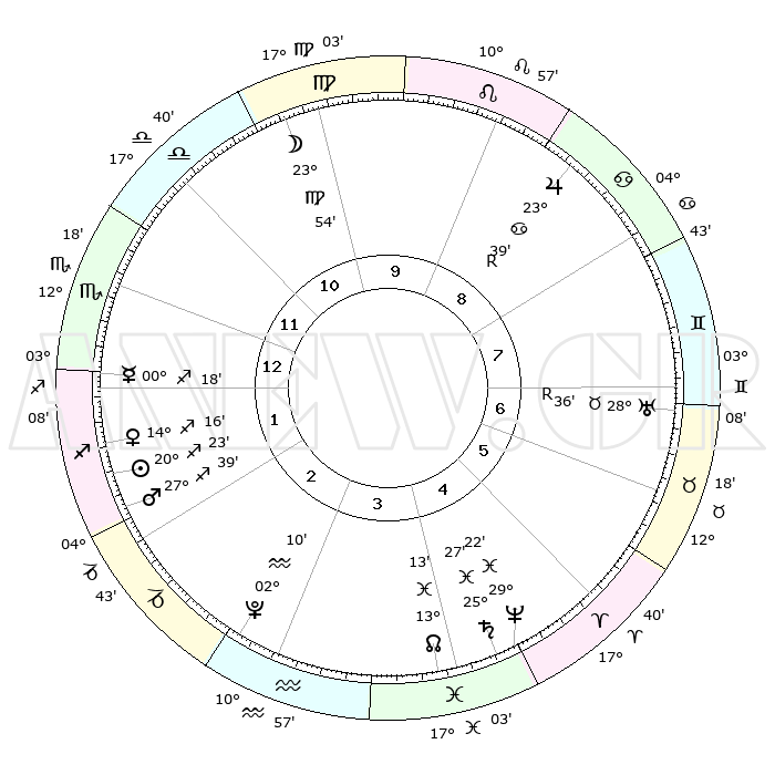 | | ΘΕΣΕΙΣ ΠΛΑΝΗΤΩΝ ΑΣΤΡΟΛΟΓΙΚΟΥ ΧΑΡΤΗ ΤΗΣ ΣΤΙΓΜΗΣ ΑΥΤΗΣ | | | | Πλανήτης | Ζώδιο | Μοίρες | Δεκαήμ. | Σε οίκο | Απόκλιση | | Ακμές των οίκων | | Ηλιος | Τοξότης | 20°18' | Τρίτο | 2 | 23 S 05 | | 1ος | 08°56' | Σκορπιός | | Σελήνη | Παρθένος | 22°52' | Τρίτο | 11 | 02 N 02 | | 2ος | 07°56' | Τοξότης | | Ερμής | Τοξότης | 00°12' | Πρώτο | 1 | 18 S 20 | | 3ος | 10°42' | Αιγόκερως | | Αφροδίτη | Τοξότης | 14°10' | Δεύτερο | 2 | 22 S 13 | | 4ος | 15°32' | Υδροχόος | | Αρης | Τοξότης | 27°35' | Τρίτο | 2 | 24 S 10 | | 5ος | 18°15' | Ιχθείς | | Δίας | Καρκίνος | 23°39'R | Τρίτο | 9 | 21 N 33 | | 6ος | 16°01' | Κριός | | Κρόνος | Ιχθείς | 25°27' | Τρίτο | 5 | 03 S 57 | | 7ος | 08°56' | Ταύρος | | Ουρανός | Ταύρος | 28°36'R | Τρίτο | 7 | 19 N 39 | | 8ος | 07°56' | Δίδυμοι | | Ποσειδώνας | Ιχθείς | 29°22' | Τρίτο | 5 | 01 S 29 | | 9ος | 10°42' | Καρκίνος | | Πλούτωνας | Υδροχόος | 02°10' | Πρώτο | 3 | 23 S 20 | | 10ος | 15°32' | Λέων | | Β. Δεσμός | Ιχθείς | 13°13' | Δεύτερο | 4 | 06 S 35 | | 11ος | 18°15' | Παρθένος | | Ωροσκόπος | Σκορπιός | 08°56' | Πρώτο | | | 12ος | 16°01' | Ζυγός | | Μεσουράνημα | Λέων | 15°32' | Δεύτερο | | | |