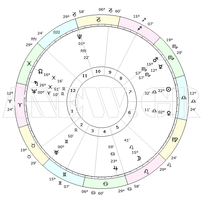 | ΘΕΣΕΙΣ ΠΛΑΝΗΤΩΝ ΑΣΤΡΟΛΟΓΙΚΟΥ ΧΑΡΤΗ ΤΗΣ ΣΤΙΓΜΗΣ ΑΥΤΗΣ | | Πλανήτης | Ζώδιο | Μοίρες | Δεκαήμ. | Σε οίκο | Απόκλιση | | Ακμές των οίκων | Ηλιος | Ζυγός | 22°14' | Τρίτο | 11 | 08 S 39 | | 1ος | 06°00' | Τοξότης | Σελήνη | Λέων | 11°51' | Δεύτερο | 8 | 20 N 11 | | 2ος | 08°02' | Αιγόκερως | Ερμής | Σκορπιός | 12°33' | Δεύτερο | 11 | 17 S 17 | | 3ος | 14°45' | Υδροχόος | Αφροδίτη | Ζυγός | 01°49' | Πρώτο | 10 | 00 N 40 | | 4ος | 20°50' | Ιχθείς | Αρης | Σκορπιός | 15°45' | Δεύτερο | 12 | 16 S 46 | | 5ος | 21°03' | Κριός | Δίας | Καρκίνος | 23°57' | Τρίτο | 8 | 21 N 21 | | 6ος | 15°18' | Ταύρος | Κρόνος | Ιχθείς | 26°52'R | Τρίτο | 4 | 03 S 32 | | 7ος | 06°00' | Δίδυμοι | Ουρανός | Δίδυμοι | 00°51'R | Πρώτο | 6 | 20 N 07 | | 8ος | 08°02' | Καρκίνος | Ποσειδώνας | Κριός | 00°10'R | Πρώτο | 4 | 01 S 12 | | 9ος | 14°45' | Λέων | Πλούτωνας | Υδροχόος | 01°22' | Πρώτο | 2 | 23 S 32 | | 10ος | 20°50' | Παρθένος | Β. Δεσμός | Ιχθείς | 16°17' | Δεύτερο | 3 | 05 S 25 | | 11ος | 21°03' | Ζυγός | Ωροσκόπος | Τοξότης | 06°00' | Πρώτο | | | 12ος | 15°18' | Σκορπιός | Μεσουράνημα | Παρθένος | 20°50' | Τρίτο | | | |