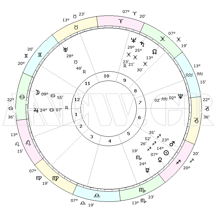 | | ΘΕΣΕΙΣ ΠΛΑΝΗΤΩΝ ΑΣΤΡΟΛΟΓΙΚΟΥ ΧΑΡΤΗ ΤΗΣ ΣΤΙΓΜΗΣ ΑΥΤΗΣ | | | | Πλανήτης | Ζώδιο | Μοίρες | Δεκαήμ. | Σε οίκο | Απόκλιση | | Ακμές των οίκων | | Ηλιος | Τοξότης | 14°50' | Δεύτερο | 6 | 22 S 34 | | 1ος | 11°40' | Καρκίνος | | Σελήνη | Καρκίνος | 09°23' | Πρώτο | 12 | 27 N 35 | | 2ος | 02°05' | Λέων | | Ερμής | Σκορπιός | 24°17' | Τρίτο | 5 | 16 S 29 | | 3ος | 24°53' | Λέων | | Αφροδίτη | Τοξότης | 07°23' | Πρώτο | 6 | 21 S 03 | | 4ος | 23°08' | Παρθένος | | Αρης | Τοξότης | 23°33' | Τρίτο | 6 | 23 S 59 | | 5ος | 28°34' | Ζυγός | | Δίας | Καρκίνος | 24°07'R | Τρίτο | 1 | 21 N 27 | | 6ος | 07°17' | Τοξότης | | Κρόνος | Ιχθείς | 25°21' | Τρίτο | 10 | 04 S 00 | | 7ος | 11°40' | Αιγόκερως | | Ουρανός | Ταύρος | 28°49'R | Τρίτο | 11 | 19 N 41 | | 8ος | 02°05' | Υδροχόος | | Ποσειδώνας | Ιχθείς | 29°23'R | Τρίτο | 10 | 01 S 29 | | 9ος | 24°53' | Υδροχόος | | Πλούτωνας | Υδροχόος | 02°02' | Πρώτο | 7 | 23 S 22 | | 10ος | 23°08' | Ιχθείς | | Β. Δεσμός | Ιχθείς | 13°31' | Δεύτερο | 9 | 06 S 29 | | 11ος | 28°34' | Κριός | | Ωροσκόπος | Καρκίνος | 11°40' | Δεύτερο | | | 12ος | 07°17' | Δίδυμοι | | Μεσουράνημα | Ιχθείς | 23°08' | Τρίτο | | | |