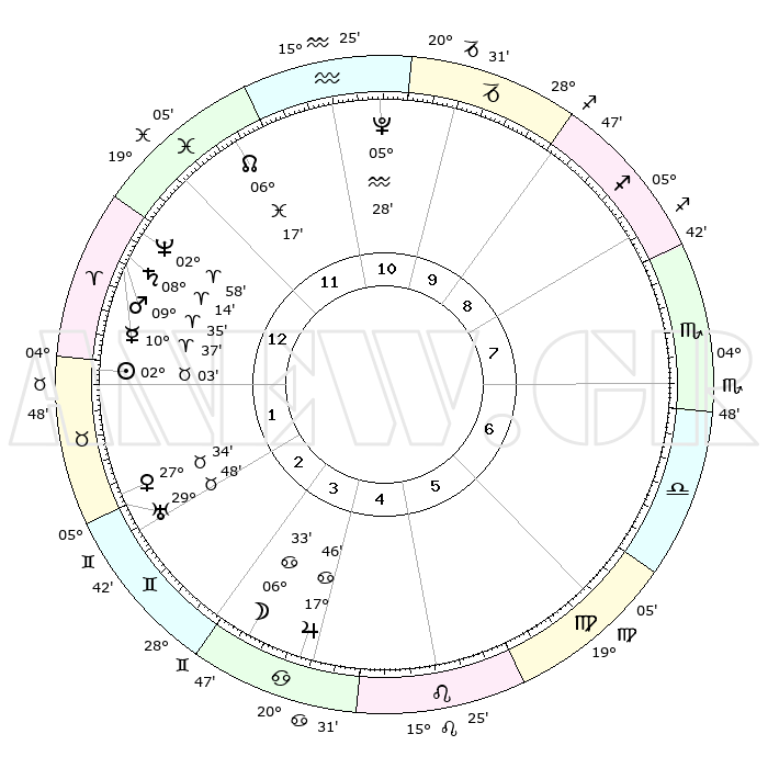 | | ΘΕΣΕΙΣ ΠΛΑΝΗΤΩΝ ΑΣΤΡΟΛΟΓΙΚΟΥ ΧΑΡΤΗ ΤΗΣ ΣΤΙΓΜΗΣ ΑΥΤΗΣ | | | | Πλανήτης | Ζώδιο | Μοίρες | Δεκαήμ. | Σε οίκο | Απόκλιση | | Ακμές των οίκων | | Ηλιος | Ταύρος | 01°59' | Πρώτο | 1 | 12 N 10 | | 1ος | 25°42' | Ιχθείς | | Σελήνη | Καρκίνος | 05°34' | Πρώτο | 4 | 27 N 49 | | 2ος | 07°00' | Ταύρος | | Ερμής | Κριός | 10°31' | Δεύτερο | 1 | 01 N 48 | | 3ος | 05°05' | Δίδυμοι | | Αφροδίτη | Ταύρος | 27°29' | Τρίτο | 2 | 20 N 05 | | 4ος | 27°35' | Δίδυμοι | | Αρης | Κριός | 09°32' | Πρώτο | 1 | 02 N 54 | | 5ος | 19°43' | Καρκίνος | | Δίας | Καρκίνος | 17°46' | Δεύτερο | 4 | 22 N 38 | | 6ος | 16°29' | Λέων | | Κρόνος | Κριός | 08°14' | Πρώτο | 1 | 01 N 17 | | 7ος | 25°42' | Παρθένος | | Ουρανός | Ταύρος | 29°48' | Τρίτο | 2 | 19 N 56 | | 8ος | 07°00' | Σκορπιός | | Ποσειδώνας | Κριός | 02°58' | Πρώτο | 1 | 00 S 02 | | 9ος | 05°05' | Τοξότης | | Πλούτωνας | Υδροχόος | 05°28' | Πρώτο | 11 | 22 S 48 | | 10ος | 27°35' | Τοξότης | | Β. Δεσμός | Ιχθείς | 06°17' | Πρώτο | 12 | 09 S 12 | | 11ος | 19°43' | Αιγόκερως | | Ωροσκόπος | Ιχθείς | 25°42' | Τρίτο | | | 12ος | 16°29' | Υδροχόος | | Μεσουράνημα | Τοξότης | 27°35' | Τρίτο | | | |