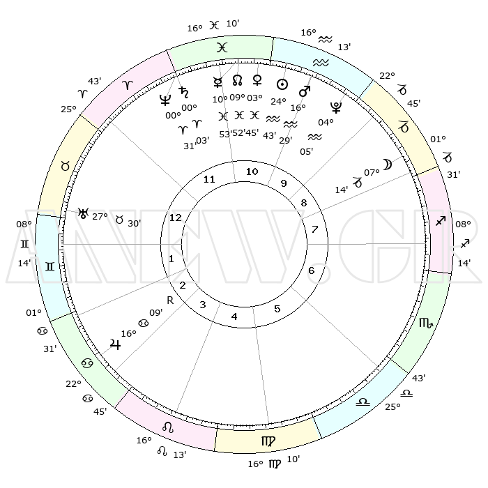 | | ΘΕΣΕΙΣ ΠΛΑΝΗΤΩΝ ΑΣΤΡΟΛΟΓΙΚΟΥ ΧΑΡΤΗ ΤΗΣ ΣΤΙΓΜΗΣ ΑΥΤΗΣ | | | | Πλανήτης | Ζώδιο | Μοίρες | Δεκαήμ. | Σε οίκο | Απόκλιση | | Ακμές των οίκων | | Ηλιος | Υδροχόος | 24°39' | Τρίτο | 11 | 13 S 18 | | 1ος | 08°57' | Ταύρος | | Σελήνη | Αιγόκερως | 06°27' | Πρώτο | 9 | 27 S 57 | | 2ος | 08°45' | Δίδυμοι | | Ερμής | Ιχθείς | 10°47' | Δεύτερο | 11 | 07 S 48 | | 3ος | 01°28' | Καρκίνος | | Αφροδίτη | Ιχθείς | 03°41' | Πρώτο | 11 | 11 S 31 | | 4ος | 23°16' | Καρκίνος | | Αρης | Υδροχόος | 16°26' | Δεύτερο | 10 | 16 S 56 | | 5ος | 18°39' | Λέων | | Δίας | Καρκίνος | 16°09'R | Δεύτερο | 3 | 22 N 47 | | 6ος | 23°09' | Παρθένος | | Κρόνος | Κριός | 00°03' | Πρώτο | 12 | 01 S 57 | | 7ος | 08°57' | Σκορπιός | | Ουρανός | Ταύρος | 27°30' | Τρίτο | 1 | 19 N 25 | | 8ος | 08°45' | Τοξότης | | Ποσειδώνας | Κριός | 00°31' | Πρώτο | 12 | 01 S 00 | | 9ος | 01°28' | Αιγόκερως | | Πλούτωνας | Υδροχόος | 04°05' | Πρώτο | 10 | 22 S 57 | | 10ος | 23°16' | Αιγόκερως | | Β. Δεσμός | Ιχθείς | 09°52' | Πρώτο | 11 | 07 S 52 | | 11ος | 18°39' | Υδροχόος | | Ωροσκόπος | Ταύρος | 08°57' | Πρώτο | | | 12ος | 23°09' | Ιχθείς | | Μεσουράνημα | Αιγόκερως | 23°16' | Τρίτο | | | |