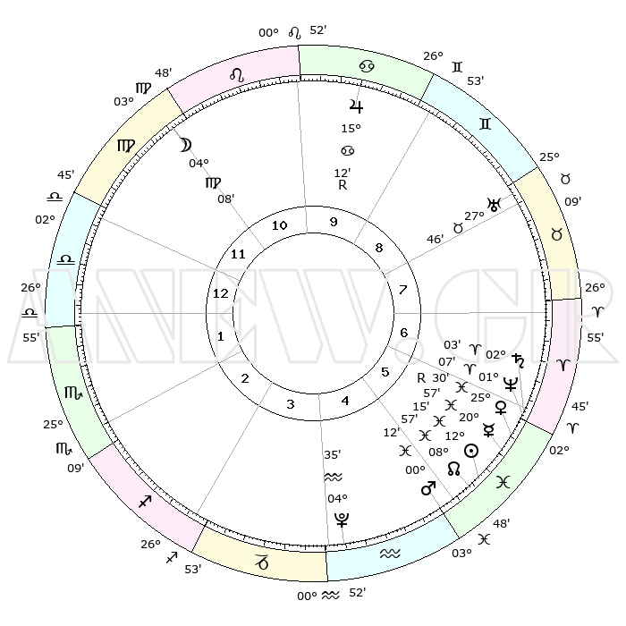 | | ΘΕΣΕΙΣ ΠΛΑΝΗΤΩΝ ΑΣΤΡΟΛΟΓΙΚΟΥ ΧΑΡΤΗ ΤΗΣ ΣΤΙΓΜΗΣ ΑΥΤΗΣ | | | | Πλανήτης | Ζώδιο | Μοίρες | Δεκαήμ. | Σε οίκο | Απόκλιση | | Ακμές των οίκων | | Ηλιος | Ιχθείς | 12°11' | Δεύτερο | 6 | 07 S 00 | | 1ος | 06°08' | Ζυγός | | Σελήνη | Παρθένος | 03°11' | Πρώτο | 11 | 10 N 50 | | 2ος | 03°09' | Σκορπιός | | Ερμής | Ιχθείς | 21°00'R | Τρίτο | 6 | 00 S 19 | | 3ος | 03°49' | Τοξότης | | Αφροδίτη | Ιχθείς | 25°25' | Τρίτο | 6 | 03 S 03 | | 4ος | 06°54' | Αιγόκερως | | Αρης | Ιχθείς | 00°08' | Πρώτο | 5 | 12 S 27 | | 5ος | 09°50' | Υδροχόος | | Δίας | Καρκίνος | 15°12'R | Δεύτερο | 10 | 22 N 55 | | 6ος | 10°01' | Ιχθείς | | Κρόνος | Κριός | 02°03' | Πρώτο | 6 | 01 S 08 | | 7ος | 06°08' | Κριός | | Ουρανός | Ταύρος | 27°46' | Τρίτο | 8 | 19 N 29 | | 8ος | 03°09' | Ταύρος | | Ποσειδώνας | Κριός | 01°07' | Πρώτο | 6 | 00 S 45 | | 9ος | 03°49' | Δίδυμοι | | Πλούτωνας | Υδροχόος | 04°35' | Πρώτο | 4 | 22 S 52 | | 10ος | 06°54' | Καρκίνος | | Β. Δεσμός | Ιχθείς | 08°57' | Πρώτο | 5 | 08 S 13 | | 11ος | 09°50' | Λέων | | Ωροσκόπος | Ζυγός | 06°08' | Πρώτο | | | 12ος | 10°01' | Παρθένος | | Μεσουράνημα | Καρκίνος | 06°54' | Πρώτο | | | |