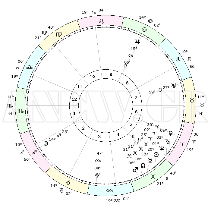 | | ΘΕΣΕΙΣ ΠΛΑΝΗΤΩΝ ΑΣΤΡΟΛΟΓΙΚΟΥ ΧΑΡΤΗ ΤΗΣ ΣΤΙΓΜΗΣ ΑΥΤΗΣ | | | | Πλανήτης | Ζώδιο | Μοίρες | Δεκαήμ. | Σε οίκο | Απόκλιση | | Ακμές των οίκων | | Ηλιος | Ιχθείς | 20°14' | Τρίτο | 5 | 03 S 52 | | 1ος | 27°25' | Ζυγός | | Σελήνη | Τοξότης | 13°48' | Δεύτερο | 2 | 27 S 40 | | 2ος | 25°41' | Σκορπιός | | Ερμής | Ιχθείς | 13°33'R | Δεύτερο | 5 | 03 S 27 | | 3ος | 27°26' | Τοξότης | | Αφροδίτη | Κριός | 05°26' | Πρώτο | 6 | 01 N 06 | | 4ος | 01°27' | Υδροχόος | | Αρης | Ιχθείς | 06°29' | Πρώτο | 5 | 10 S 09 | | 5ος | 04°24' | Ιχθείς | | Δίας | Καρκίνος | 15°05'R | Δεύτερο | 9 | 22 N 56 | | 6ος | 03°18' | Κριός | | Κρόνος | Κριός | 03°02' | Πρώτο | 5 | 00 S 45 | | 7ος | 27°25' | Κριός | | Ουρανός | Ταύρος | 27°59' | Τρίτο | 8 | 19 N 32 | | 8ος | 25°41' | Ταύρος | | Ποσειδώνας | Κριός | 01°25' | Πρώτο | 5 | 00 S 38 | | 9ος | 27°26' | Δίδυμοι | | Πλούτωνας | Υδροχόος | 04°47' | Πρώτο | 4 | 22 S 50 | | 10ος | 01°27' | Λέων | | Β. Δεσμός | Ιχθείς | 08°31' | Πρώτο | 5 | 08 S 22 | | 11ος | 04°24' | Παρθένος | | Ωροσκόπος | Ζυγός | 27°25' | Τρίτο | | | 12ος | 03°18' | Ζυγός | | Μεσουράνημα | Λέων | 01°27' | Πρώτο | | | |