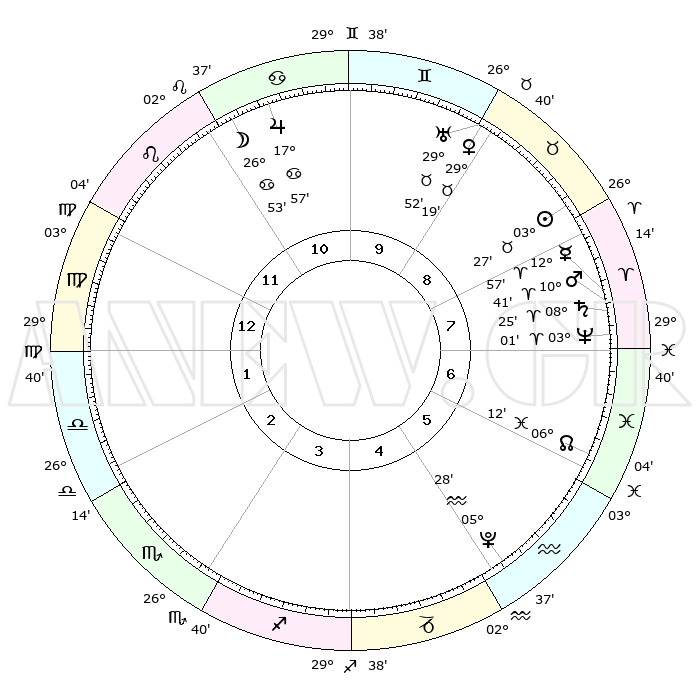 | | ΘΕΣΕΙΣ ΠΛΑΝΗΤΩΝ ΑΣΤΡΟΛΟΓΙΚΟΥ ΧΑΡΤΗ ΤΗΣ ΣΤΙΓΜΗΣ ΑΥΤΗΣ | | | | Πλανήτης | Ζώδιο | Μοίρες | Δεκαήμ. | Σε οίκο | Απόκλιση | | Ακμές των οίκων | | Ηλιος | Ταύρος | 03°23' | Πρώτο | 9 | 12 N 38 | | 1ος | 07°49' | Παρθένος | | Σελήνη | Καρκίνος | 25°50' | Τρίτο | 11 | 24 N 18 | | 2ος | 02°29' | Ζυγός | | Ερμής | Κριός | 12°50' | Δεύτερο | 8 | 02 N 45 | | 3ος | 01°47' | Σκορπιός | | Αφροδίτη | Ταύρος | 29°13' | Τρίτο | 9 | 20 N 32 | | 4ος | 04°44' | Τοξότης | | Αρης | Κριός | 10°38' | Δεύτερο | 8 | 03 N 21 | | 5ος | 08°26' | Αιγόκερως | | Δίας | Καρκίνος | 17°56' | Δεύτερο | 11 | 22 N 37 | | 6ος | 09°51' | Υδροχόος | | Κρόνος | Κριός | 08°24' | Πρώτο | 8 | 01 N 21 | | 7ος | 07°49' | Ιχθείς | | Ουρανός | Ταύρος | 29°52' | Τρίτο | 9 | 19 N 57 | | 8ος | 02°29' | Κριός | | Ποσειδώνας | Κριός | 03°01' | Πρώτο | 8 | 00 S 00 | | 9ος | 01°47' | Ταύρος | | Πλούτωνας | Υδροχόος | 05°28' | Πρώτο | 5 | 22 S 48 | | 10ος | 04°44' | Δίδυμοι | | Β. Δεσμός | Ιχθείς | 06°13' | Πρώτο | 6 | 09 S 14 | | 11ος | 08°26' | Καρκίνος | | Ωροσκόπος | Παρθένος | 07°49' | Πρώτο | | | 12ος | 09°51' | Λέων | | Μεσουράνημα | Δίδυμοι | 04°44' | Πρώτο | | | |