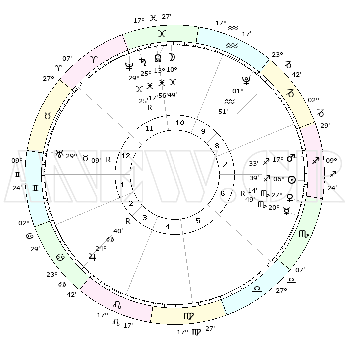 | | ΘΕΣΕΙΣ ΠΛΑΝΗΤΩΝ ΑΣΤΡΟΛΟΓΙΚΟΥ ΧΑΡΤΗ ΤΗΣ ΣΤΙΓΜΗΣ ΑΥΤΗΣ | | | | Πλανήτης | Ζώδιο | Μοίρες | Δεκαήμ. | Σε οίκο | Απόκλιση | | Ακμές των οίκων | | Ηλιος | Τοξότης | 06°36' | Πρώτο | 7 | 21 S 24 | | 1ος | 24°36' | Ταύρος | | Σελήνη | Ιχθείς | 10°21' | Δεύτερο | 11 | 08 S 01 | | 2ος | 20°33' | Δίδυμοι | | Ερμής | Σκορπιός | 20°49'R | Τρίτο | 6 | 15 S 35 | | 3ος | 12°12' | Καρκίνος | | Αφροδίτη | Σκορπιός | 27°11' | Τρίτο | 7 | 18 S 45 | | 4ος | 04°37' | Λέων | | Αρης | Τοξότης | 17°32' | Δεύτερο | 7 | 23 S 29 | | 5ος | 02°11' | Παρθένος | | Δίας | Καρκίνος | 24°40'R | Τρίτο | 3 | 21 N 20 | | 6ος | 09°43' | Ζυγός | | Κρόνος | Ιχθείς | 25°17' | Τρίτο | 11 | 04 S 03 | | 7ος | 24°36' | Σκορπιός | | Ουρανός | Ταύρος | 29°09'R | Τρίτο | 1 | 19 N 46 | | 8ος | 20°33' | Τοξότης | | Ποσειδώνας | Ιχθείς | 29°25'R | Τρίτο | 11 | 01 S 29 | | 9ος | 12°12' | Αιγόκερως | | Πλούτωνας | Υδροχόος | 01°51' | Πρώτο | 9 | 23 S 25 | | 10ος | 04°37' | Υδροχόος | | Β. Δεσμός | Ιχθείς | 13°56' | Δεύτερο | 11 | 06 S 19 | | 11ος | 02°11' | Ιχθείς | | Ωροσκόπος | Ταύρος | 24°36' | Τρίτο | | | 12ος | 09°43' | Κριός | | Μεσουράνημα | Υδροχόος | 04°37' | Πρώτο | | | |