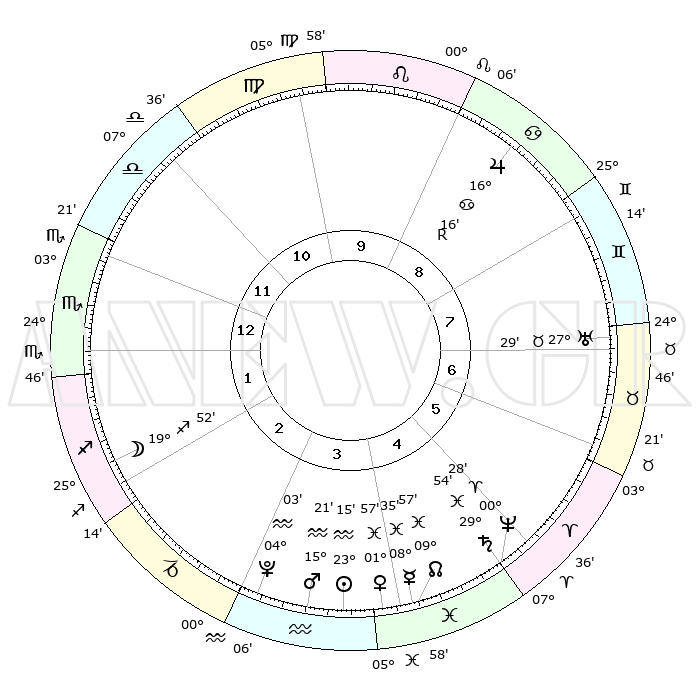 | | ΘΕΣΕΙΣ ΠΛΑΝΗΤΩΝ ΑΣΤΡΟΛΟΓΙΚΟΥ ΧΑΡΤΗ ΤΗΣ ΣΤΙΓΜΗΣ ΑΥΤΗΣ | | | | Πλανήτης | Ζώδιο | Μοίρες | Δεκαήμ. | Σε οίκο | Απόκλιση | | Ακμές των οίκων | | Ηλιος | Υδροχόος | 23°12' | Τρίτο | 4 | 13 S 47 | | 1ος | 07°41' | Σκορπιός | | Σελήνη | Τοξότης | 19°09' | Δεύτερο | 2 | 28 S 09 | | 2ος | 06°35' | Τοξότης | | Ερμής | Ιχθείς | 08°29' | Πρώτο | 4 | 08 S 55 | | 3ος | 09°14' | Αιγόκερως | | Αφροδίτη | Ιχθείς | 01°53' | Πρώτο | 4 | 12 S 10 | | 4ος | 13°58' | Υδροχόος | | Αρης | Υδροχόος | 15°18' | Δεύτερο | 4 | 17 S 16 | | 5ος | 16°44' | Ιχθείς | | Δίας | Καρκίνος | 16°17'R | Δεύτερο | 9 | 22 N 46 | | 6ος | 14°38' | Κριός | | Κρόνος | Ιχθείς | 29°53' | Τρίτο | 5 | 02 S 01 | | 7ος | 07°41' | Ταύρος | | Ουρανός | Ταύρος | 27°29' | Τρίτο | 7 | 19 N 25 | | 8ος | 06°35' | Δίδυμοι | | Ποσειδώνας | Κριός | 00°28' | Πρώτο | 5 | 01 S 01 | | 9ος | 09°14' | Καρκίνος | | Πλούτωνας | Υδροχόος | 04°03' | Πρώτο | 3 | 22 S 57 | | 10ος | 13°58' | Λέων | | Β. Δεσμός | Ιχθείς | 09°57' | Πρώτο | 4 | 07 S 50 | | 11ος | 16°44' | Παρθένος | | Ωροσκόπος | Σκορπιός | 07°41' | Πρώτο | | | 12ος | 14°38' | Ζυγός | | Μεσουράνημα | Λέων | 13°58' | Δεύτερο | | | |