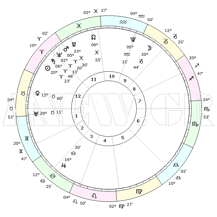 | | ΘΕΣΕΙΣ ΠΛΑΝΗΤΩΝ ΑΣΤΡΟΛΟΓΙΚΟΥ ΧΑΡΤΗ ΤΗΣ ΣΤΙΓΜΗΣ ΑΥΤΗΣ | | | | Πλανήτης | Ζώδιο | Μοίρες | Δεκαήμ. | Σε οίκο | Απόκλιση | | Ακμές των οίκων | | Ηλιος | Κριός | 20°13' | Τρίτο | 2 | 07 N 54 | | 1ος | 26°36' | Υδροχόος | | Σελήνη | Αιγόκερως | 18°47' | Δεύτερο | 11 | 26 S 00 | | 2ος | 12°15' | Κριός | | Ερμής | Ιχθείς | 23°18' | Τρίτο | 1 | 04 S 49 | | 3ος | 15°38' | Ταύρος | | Αφροδίτη | Ταύρος | 12°48' | Δεύτερο | 2 | 15 N 38 | | 4ος | 10°23' | Δίδυμοι | | Αρης | Κριός | 00°13' | Πρώτο | 1 | 00 S 50 | | 5ος | 02°06' | Καρκίνος | | Δίας | Καρκίνος | 16°29' | Δεύτερο | 5 | 22 N 47 | | 6ος | 25°19' | Καρκίνος | | Κρόνος | Κριός | 06°47' | Πρώτο | 1 | 00 N 44 | | 7ος | 26°36' | Λέων | | Ουρανός | Ταύρος | 29°11' | Τρίτο | 3 | 19 N 48 | | 8ος | 12°15' | Ζυγός | | Ποσειδώνας | Κριός | 02°33' | Πρώτο | 1 | 00 S 11 | | 9ος | 15°38' | Σκορπιός | | Πλούτωνας | Υδροχόος | 05°21' | Πρώτο | 12 | 22 S 47 | | 10ος | 10°23' | Τοξότης | | Β. Δεσμός | Ιχθείς | 06°55' | Πρώτο | 1 | 08 S 58 | | 11ος | 02°06' | Αιγόκερως | | Ωροσκόπος | Υδροχόος | 26°36' | Τρίτο | | | 12ος | 25°19' | Αιγόκερως | | Μεσουράνημα | Τοξότης | 10°23' | Δεύτερο | | | |