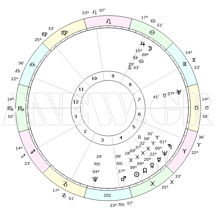 | | ΘΕΣΕΙΣ ΠΛΑΝΗΤΩΝ ΑΣΤΡΟΛΟΓΙΚΟΥ ΧΑΡΤΗ ΤΗΣ ΣΤΙΓΜΗΣ ΑΥΤΗΣ | | | | Πλανήτης | Ζώδιο | Μοίρες | Δεκαήμ. | Σε οίκο | Απόκλιση | | Ακμές των οίκων | | Ηλιος | Ιχθείς | 08°15' | Πρώτο | 5 | 08 S 29 | | 1ος | 27°59' | Ζυγός | | Σελήνη | Καρκίνος | 08°54' | Πρώτο | 9 | 27 N 42 | | 2ος | 26°17' | Σκορπιός | | Ερμής | Ιχθείς | 22°32'R | Τρίτο | 5 | 00 S 17 | | 3ος | 28°05' | Τοξότης | | Αφροδίτη | Ιχθείς | 20°32' | Τρίτο | 5 | 05 S 02 | | 4ος | 02°08' | Υδροχόος | | Αρης | Υδροχόος | 27°03' | Τρίτο | 4 | 13 S 31 | | 5ος | 05°04' | Ιχθείς | | Δίας | Καρκίνος | 15°20'R | Δεύτερο | 9 | 22 N 54 | | 6ος | 03°55' | Κριός | | Κρόνος | Κριός | 01°35' | Πρώτο | 5 | 01 S 20 | | 7ος | 27°59' | Κριός | | Ουρανός | Ταύρος | 27°41' | Τρίτο | 8 | 19 N 28 | | 8ος | 26°17' | Ταύρος | | Ποσειδώνας | Κριός | 00°58' | Πρώτο | 5 | 00 S 49 | | 9ος | 28°05' | Δίδυμοι | | Πλούτωνας | Υδροχόος | 04°29' | Πρώτο | 4 | 22 S 53 | | 10ος | 02°08' | Λέων | | Β. Δεσμός | Ιχθείς | 09°10' | Πρώτο | 5 | 08 S 08 | | 11ος | 05°04' | Παρθένος | | Ωροσκόπος | Ζυγός | 27°59' | Τρίτο | | | 12ος | 03°55' | Ζυγός | | Μεσουράνημα | Λέων | 02°08' | Πρώτο | | | |