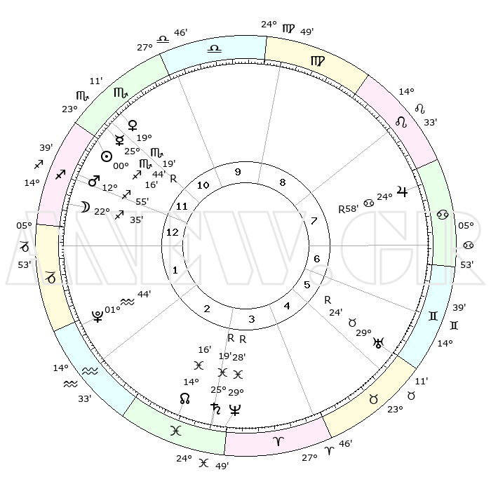 | | ΘΕΣΕΙΣ ΠΛΑΝΗΤΩΝ ΑΣΤΡΟΛΟΓΙΚΟΥ ΧΑΡΤΗ ΤΗΣ ΣΤΙΓΜΗΣ ΑΥΤΗΣ | | | | Πλανήτης | Ζώδιο | Μοίρες | Δεκαήμ. | Σε οίκο | Απόκλιση | | Ακμές των οίκων | | Ηλιος | Τοξότης | 00°13' | Πρώτο | 12 | 20 S 11 | | 1ος | 19°33' | Τοξότης | | Σελήνη | Τοξότης | 21°60' | Τρίτο | 1 | 28 S 09 | | 2ος | 24°13' | Αιγόκερως | | Ερμής | Σκορπιός | 25°48'R | Τρίτο | 11 | 18 S 05 | | 3ος | 03°05' | Ιχθείς | | Αφροδίτη | Σκορπιός | 19°15' | Δεύτερο | 11 | 16 S 34 | | 4ος | 08°25' | Κριός | | Αρης | Τοξότης | 12°52' | Δεύτερο | 12 | 22 S 55 | | 5ος | 06°27' | Ταύρος | | Δίας | Καρκίνος | 24°58'R | Τρίτο | 8 | 21 N 16 | | 6ος | 29°07' | Ταύρος | | Κρόνος | Ιχθείς | 25°19'R | Τρίτο | 3 | 04 S 04 | | 7ος | 19°33' | Δίδυμοι | | Ουρανός | Ταύρος | 29°24'R | Τρίτο | 6 | 19 N 49 | | 8ος | 24°13' | Καρκίνος | | Ποσειδώνας | Ιχθείς | 29°28'R | Τρίτο | 3 | 01 S 28 | | 9ος | 03°05' | Παρθένος | | Πλούτωνας | Υδροχόος | 01°44' | Πρώτο | 2 | 23 S 26 | | 10ος | 08°25' | Ζυγός | | Β. Δεσμός | Ιχθείς | 14°16' | Δεύτερο | 3 | 06 S 11 | | 11ος | 06°27' | Σκορπιός | | Ωροσκόπος | Τοξότης | 19°33' | Δεύτερο | | | 12ος | 29°07' | Σκορπιός | | Μεσουράνημα | Ζυγός | 08°25' | Πρώτο | | | |