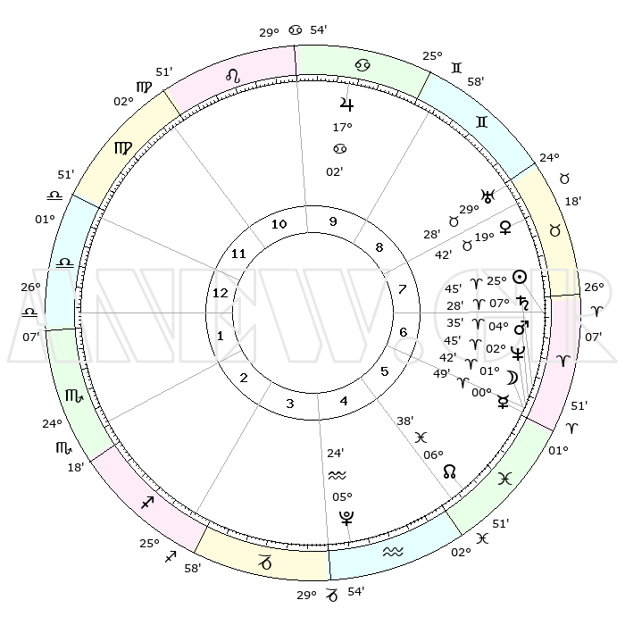 | | ΘΕΣΕΙΣ ΠΛΑΝΗΤΩΝ ΑΣΤΡΟΛΟΓΙΚΟΥ ΧΑΡΤΗ ΤΗΣ ΣΤΙΓΜΗΣ ΑΥΤΗΣ | | | | Πλανήτης | Ζώδιο | Μοίρες | Δεκαήμ. | Σε οίκο | Απόκλιση | | Ακμές των οίκων | | Ηλιος | Κριός | 25°40' | Τρίτο | 7 | 09 N 55 | | 1ος | 04°42' | Ζυγός | | Σελήνη | Κριός | 00°40' | Πρώτο | 6 | 02 N 05 | | 2ος | 01°37' | Σκορπιός | | Ερμής | Κριός | 00°42' | Πρώτο | 6 | 02 S 07 | | 3ος | 02°14' | Τοξότης | | Αφροδίτη | Ταύρος | 19°36' | Δεύτερο | 8 | 17 N 49 | | 4ος | 05°17' | Αιγόκερως | | Αρης | Κριός | 04°32' | Πρώτο | 6 | 00 N 54 | | 5ος | 08°13' | Υδροχόος | | Δίας | Καρκίνος | 17°02' | Δεύτερο | 10 | 22 N 44 | | 6ος | 08°28' | Ιχθείς | | Κρόνος | Κριός | 07°28' | Πρώτο | 7 | 00 N 59 | | 7ος | 04°42' | Κριός | | Ουρανός | Ταύρος | 29°27' | Τρίτο | 8 | 19 N 52 | | 8ος | 01°37' | Ταύρος | | Ποσειδώνας | Κριός | 02°45' | Πρώτο | 6 | 00 S 07 | | 9ος | 02°14' | Δίδυμοι | | Πλούτωνας | Υδροχόος | 05°24' | Πρώτο | 4 | 22 S 47 | | 10ος | 05°17' | Καρκίνος | | Β. Δεσμός | Ιχθείς | 06°38' | Πρώτο | 5 | 09 S 05 | | 11ος | 08°13' | Λέων | | Ωροσκόπος | Ζυγός | 04°42' | Πρώτο | | | 12ος | 08°28' | Παρθένος | | Μεσουράνημα | Καρκίνος | 05°17' | Πρώτο | | | |