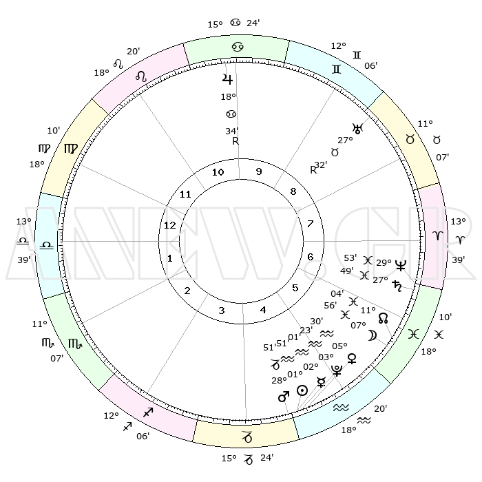 | | ΘΕΣΕΙΣ ΠΛΑΝΗΤΩΝ ΑΣΤΡΟΛΟΓΙΚΟΥ ΧΑΡΤΗ ΤΗΣ ΣΤΙΓΜΗΣ ΑΥΤΗΣ | | | | Πλανήτης | Ζώδιο | Μοίρες | Δεκαήμ. | Σε οίκο | Απόκλιση | | Ακμές των οίκων | | Ηλιος | Υδροχόος | 01°47' | Πρώτο | 5 | 19 S 45 | | 1ος | 21°45' | Παρθένος | | Σελήνη | Ιχθείς | 06°58' | Πρώτο | 6 | 09 S 09 | | 2ος | 17°41' | Ζυγός | | Ερμής | Υδροχόος | 01°54' | Πρώτο | 5 | 21 S 44 | | 3ος | 17°47' | Σκορπιός | | Αφροδίτη | Υδροχόος | 05°24' | Πρώτο | 5 | 20 S 02 | | 4ος | 20°43' | Τοξότης | | Αρης | Αιγόκερως | 28°47' | Τρίτο | 5 | 21 S 23 | | 5ος | 23°51' | Αιγόκερως | | Δίας | Καρκίνος | 18°35'R | Δεύτερο | 10 | 22 N 26 | | 6ος | 24°36' | Υδροχόος | | Κρόνος | Ιχθείς | 27°49' | Τρίτο | 7 | 02 S 53 | | 7ος | 21°45' | Ιχθείς | | Ουρανός | Ταύρος | 27°32'R | Τρίτο | 9 | 19 N 25 | | 8ος | 17°41' | Κριός | | Ποσειδώνας | Ιχθείς | 29°53' | Τρίτο | 7 | 01 S 15 | | 9ος | 17°47' | Ταύρος | | Πλούτωνας | Υδροχόος | 03°23' | Πρώτο | 5 | 23 S 05 | | 10ος | 20°43' | Δίδυμοι | | Β. Δεσμός | Ιχθείς | 11°04' | Δεύτερο | 6 | 07 S 25 | | 11ος | 23°51' | Καρκίνος | | Ωροσκόπος | Παρθένος | 21°45' | Τρίτο | | | 12ος | 24°36' | Λέων | | Μεσουράνημα | Δίδυμοι | 20°43' | Τρίτο | | | |
