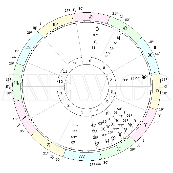 | | ΘΕΣΕΙΣ ΠΛΑΝΗΤΩΝ ΑΣΤΡΟΛΟΓΙΚΟΥ ΧΑΡΤΗ ΤΗΣ ΣΤΙΓΜΗΣ ΑΥΤΗΣ | | | | Πλανήτης | Ζώδιο | Μοίρες | Δεκαήμ. | Σε οίκο | Απόκλιση | | Ακμές των οίκων | | Ηλιος | Ιχθείς | 10°15' | Δεύτερο | 5 | 07 S 43 | | 1ος | 29°23' | Ζυγός | | Σελήνη | Λέων | 06°57' | Πρώτο | 10 | 21 N 15 | | 2ος | 27°45' | Σκορπιός | | Ερμής | Ιχθείς | 22°02'R | Τρίτο | 5 | 00 S 09 | | 3ος | 29°39' | Τοξότης | | Αφροδίτη | Ιχθείς | 23°02' | Τρίτο | 5 | 04 S 01 | | 4ος | 03°48' | Υδροχόος | | Αρης | Υδροχόος | 28°38' | Τρίτο | 4 | 12 S 58 | | 5ος | 06°44' | Ιχθείς | | Δίας | Καρκίνος | 15°15'R | Δεύτερο | 9 | 22 N 54 | | 6ος | 05°27' | Κριός | | Κρόνος | Κριός | 01°49' | Πρώτο | 5 | 01 S 14 | | 7ος | 29°23' | Κριός | | Ουρανός | Ταύρος | 27°44' | Τρίτο | 7 | 19 N 28 | | 8ος | 27°45' | Ταύρος | | Ποσειδώνας | Κριός | 01°03' | Πρώτο | 5 | 00 S 47 | | 9ος | 29°39' | Δίδυμοι | | Πλούτωνας | Υδροχόος | 04°32' | Πρώτο | 4 | 22 S 53 | | 10ος | 03°48' | Λέων | | Β. Δεσμός | Ιχθείς | 09°03' | Πρώτο | 5 | 08 S 10 | | 11ος | 06°44' | Παρθένος | | Ωροσκόπος | Ζυγός | 29°23' | Τρίτο | | | 12ος | 05°27' | Ζυγός | | Μεσουράνημα | Λέων | 03°48' | Πρώτο | | | |