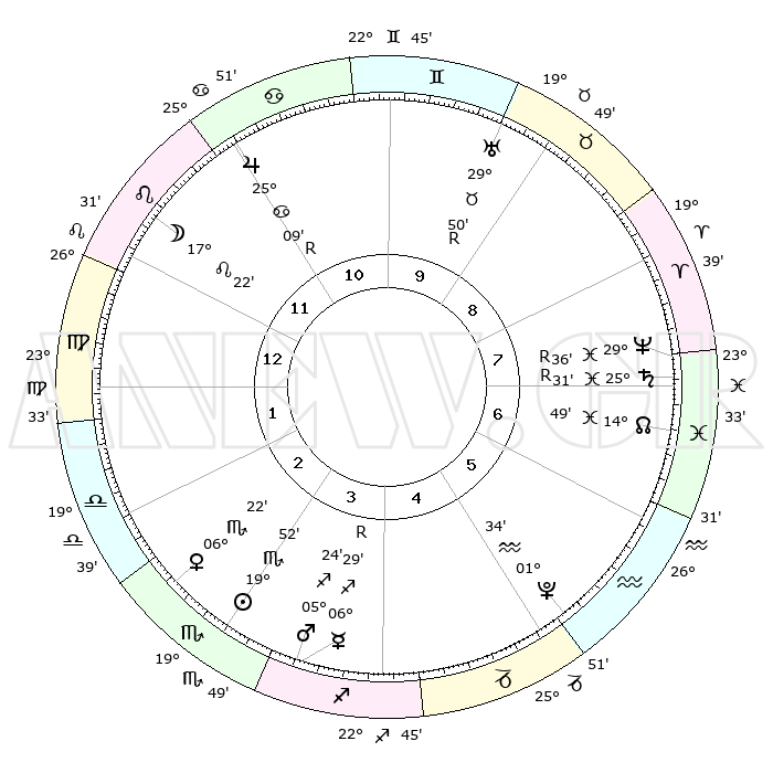 | | ΘΕΣΕΙΣ ΠΛΑΝΗΤΩΝ ΑΣΤΡΟΛΟΓΙΚΟΥ ΧΑΡΤΗ ΤΗΣ ΣΤΙΓΜΗΣ ΑΥΤΗΣ | | | | Πλανήτης | Ζώδιο | Μοίρες | Δεκαήμ. | Σε οίκο | Απόκλιση | | Ακμές των οίκων | | Ηλιος | Σκορπιός | 19°48' | Δεύτερο | 3 | 17 S 41 | | 1ος | 02°46' | Παρθένος | | Σελήνη | Λέων | 16°26' | Δεύτερο | 12 | 18 N 19 | | 2ος | 26°55' | Παρθένος | | Ερμής | Τοξότης | 06°30'R | Πρώτο | 4 | 23 S 20 | | 3ος | 25°50' | Ζυγός | | Αφροδίτη | Σκορπιός | 06°17' | Πρώτο | 3 | 12 S 24 | | 4ος | 28°46' | Σκορπιός | | Αρης | Τοξότης | 05°21' | Πρώτο | 4 | 21 S 41 | | 5ος | 02°47' | Αιγόκερως | | Δίας | Καρκίνος | 25°09'R | Τρίτο | 11 | 21 N 12 | | 6ος | 04°31' | Υδροχόος | | Κρόνος | Ιχθείς | 25°31'R | Τρίτο | 7 | 04 S 01 | | 7ος | 02°46' | Ιχθείς | | Ουρανός | Ταύρος | 29°50'R | Τρίτο | 10 | 19 N 54 | | 8ος | 26°55' | Ιχθείς | | Ποσειδώνας | Ιχθείς | 29°36'R | Τρίτο | 8 | 01 S 25 | | 9ος | 25°50' | Κριός | | Πλούτωνας | Υδροχόος | 01°34' | Πρώτο | 5 | 23 S 29 | | 10ος | 28°46' | Ταύρος | | Β. Δεσμός | Ιχθείς | 14°49' | Δεύτερο | 7 | 05 S 59 | | 11ος | 02°47' | Καρκίνος | | Ωροσκόπος | Παρθένος | 02°46' | Πρώτο | | | 12ος | 04°31' | Λέων | | Μεσουράνημα | Ταύρος | 28°46' | Τρίτο | | | |