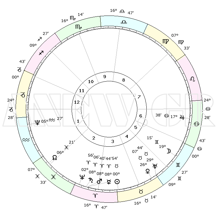 | | ΘΕΣΕΙΣ ΠΛΑΝΗΤΩΝ ΑΣΤΡΟΛΟΓΙΚΟΥ ΧΑΡΤΗ ΤΗΣ ΣΤΙΓΜΗΣ ΑΥΤΗΣ | | | | Πλανήτης | Ζώδιο | Μοίρες | Δεκαήμ. | Σε οίκο | Απόκλιση | | Ακμές των οίκων | | Ηλιος | Ταύρος | 00°49' | Πρώτο | 4 | 11 N 45 | | 1ος | 27°55' | Τοξότης | | Σελήνη | Δίδυμοι | 18°09' | Δεύτερο | 6 | 27 N 54 | | 2ος | 04°32' | Υδροχόος | | Ερμής | Κριός | 08°37' | Πρώτο | 3 | 01 N 01 | | 3ος | 14°23' | Ιχθείς | | Αφροδίτη | Ταύρος | 26°02' | Τρίτο | 5 | 19 N 41 | | 4ος | 18°38' | Κριός | | Αρης | Κριός | 08°37' | Πρώτο | 3 | 02 N 32 | | 5ος | 15°17' | Ταύρος | | Δίας | Καρκίνος | 17°37' | Δεύτερο | 7 | 22 N 39 | | 6ος | 07°14' | Δίδυμοι | | Κρόνος | Κριός | 08°06' | Πρώτο | 3 | 01 N 14 | | 7ος | 27°55' | Δίδυμοι | | Ουρανός | Ταύρος | 29°44' | Τρίτο | 5 | 19 N 55 | | 8ος | 04°32' | Λέων | | Ποσειδώνας | Κριός | 02°56' | Πρώτο | 3 | 00 S 03 | | 9ος | 14°23' | Παρθένος | | Πλούτωνας | Υδροχόος | 05°27' | Πρώτο | 2 | 22 S 48 | | 10ος | 18°38' | Ζυγός | | Β. Δεσμός | Ιχθείς | 06°21' | Πρώτο | 2 | 09 S 11 | | 11ος | 15°17' | Σκορπιός | | Ωροσκόπος | Τοξότης | 27°55' | Τρίτο | | | 12ος | 07°14' | Τοξότης | | Μεσουράνημα | Ζυγός | 18°38' | Δεύτερο | | | |