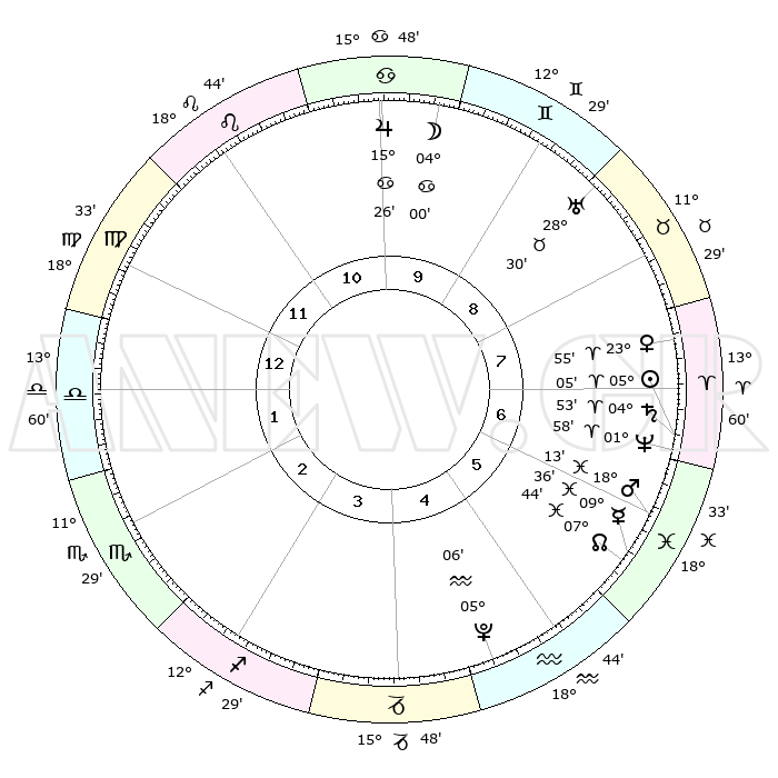 | | ΘΕΣΕΙΣ ΠΛΑΝΗΤΩΝ ΑΣΤΡΟΛΟΓΙΚΟΥ ΧΑΡΤΗ ΤΗΣ ΣΤΙΓΜΗΣ ΑΥΤΗΣ | | | | Πλανήτης | Ζώδιο | Μοίρες | Δεκαήμ. | Σε οίκο | Απόκλιση | | Ακμές των οίκων | | Ηλιος | Κριός | 05°01' | Πρώτο | 7 | 01 N 59 | | 1ος | 24°57' | Παρθένος | | Σελήνη | Καρκίνος | 03°05' | Πρώτο | 10 | 28 N 10 | | 2ος | 21°10' | Ζυγός | | Ερμής | Ιχθείς | 09°34' | Πρώτο | 6 | 08 S 06 | | 3ος | 21°24' | Σκορπιός | | Αφροδίτη | Κριός | 23°50' | Τρίτο | 8 | 08 N 36 | | 4ος | 24°20' | Τοξότης | | Αρης | Ιχθείς | 18°10' | Δεύτερο | 6 | 05 S 40 | | 5ος | 27°24' | Αιγόκερως | | Δίας | Καρκίνος | 15°26' | Δεύτερο | 10 | 22 N 54 | | 6ος | 28°01' | Υδροχόος | | Κρόνος | Κριός | 04°52' | Πρώτο | 7 | 00 S 01 | | 7ος | 24°57' | Ιχθείς | | Ουρανός | Ταύρος | 28°30' | Τρίτο | 9 | 19 N 39 | | 8ος | 21°10' | Κριός | | Ποσειδώνας | Κριός | 01°58' | Πρώτο | 7 | 00 S 25 | | 9ος | 21°24' | Ταύρος | | Πλούτωνας | Υδροχόος | 05°06' | Πρώτο | 5 | 22 S 48 | | 10ος | 24°20' | Δίδυμοι | | Β. Δεσμός | Ιχθείς | 07°44' | Πρώτο | 6 | 08 S 40 | | 11ος | 27°24' | Καρκίνος | | Ωροσκόπος | Παρθένος | 24°57' | Τρίτο | | | 12ος | 28°01' | Λέων | | Μεσουράνημα | Δίδυμοι | 24°20' | Τρίτο | | | |