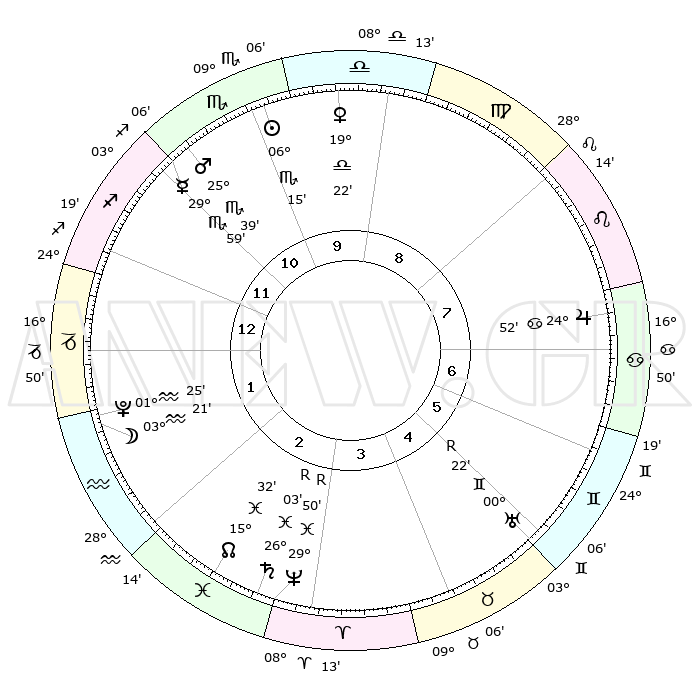 | | ΘΕΣΕΙΣ ΠΛΑΝΗΤΩΝ ΑΣΤΡΟΛΟΓΙΚΟΥ ΧΑΡΤΗ ΤΗΣ ΣΤΙΓΜΗΣ ΑΥΤΗΣ | | | | Πλανήτης | Ζώδιο | Μοίρες | Δεκαήμ. | Σε οίκο | Απόκλιση | | Ακμές των οίκων | | Ηλιος | Σκορπιός | 06°08' | Πρώτο | 11 | 13 S 34 | | 1ος | 08°29' | Τοξότης | | Σελήνη | Υδροχόος | 01°53' | Πρώτο | 2 | 23 S 17 | | 2ος | 10°57' | Αιγόκερως | | Ερμής | Σκορπιός | 29°52' | Τρίτο | 12 | 22 S 54 | | 3ος | 18°05' | Υδροχόος | | Αφροδίτη | Ζυγός | 19°13' | Δεύτερο | 10 | 06 S 08 | | 4ος | 24°07' | Ιχθείς | | Αρης | Σκορπιός | 25°34' | Τρίτο | 12 | 19 S 30 | | 5ος | 23°58' | Κριός | | Δίας | Καρκίνος | 24°52' | Τρίτο | 8 | 21 N 14 | | 6ος | 17°54' | Ταύρος | | Κρόνος | Ιχθείς | 26°03'R | Τρίτο | 4 | 03 S 50 | | 7ος | 08°29' | Δίδυμοι | | Ουρανός | Δίδυμοι | 00°22'R | Πρώτο | 6 | 20 N 01 | | 8ος | 10°57' | Καρκίνος | | Ποσειδώνας | Ιχθείς | 29°51'R | Τρίτο | 4 | 01 S 19 | | 9ος | 18°05' | Λέων | | Πλούτωνας | Υδροχόος | 01°25' | Πρώτο | 2 | 23 S 31 | | 10ος | 24°07' | Παρθένος | | Β. Δεσμός | Ιχθείς | 15°33' | Δεύτερο | 3 | 05 S 42 | | 11ος | 23°58' | Ζυγός | | Ωροσκόπος | Τοξότης | 08°29' | Πρώτο | | | 12ος | 17°54' | Σκορπιός | | Μεσουράνημα | Παρθένος | 24°07' | Τρίτο | | | |