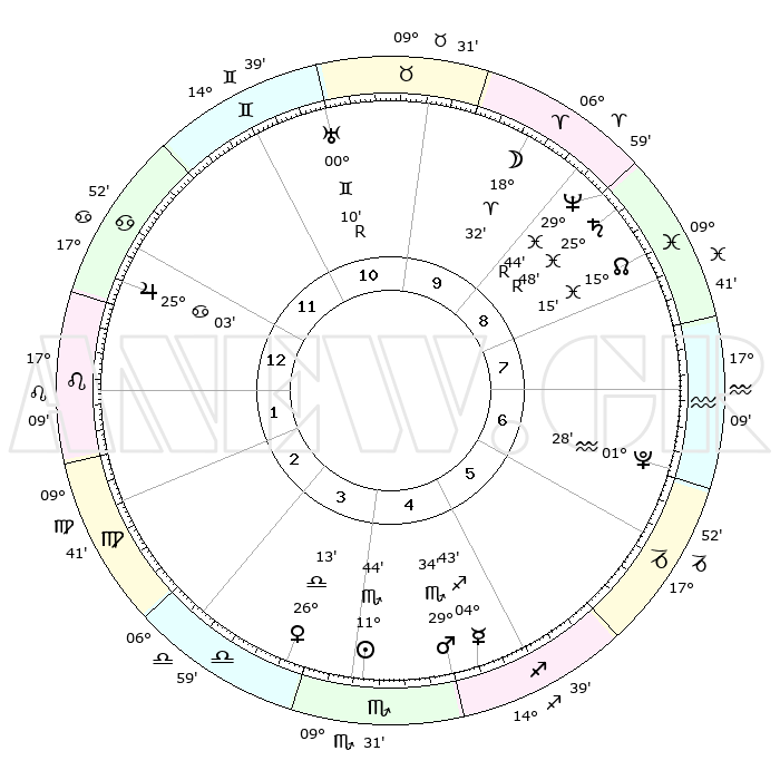 | | ΘΕΣΕΙΣ ΠΛΑΝΗΤΩΝ ΑΣΤΡΟΛΟΓΙΚΟΥ ΧΑΡΤΗ ΤΗΣ ΣΤΙΓΜΗΣ ΑΥΤΗΣ | | | | Πλανήτης | Ζώδιο | Μοίρες | Δεκαήμ. | Σε οίκο | Απόκλιση | | Ακμές των οίκων | | Ηλιος | Σκορπιός | 11°26' | Δεύτερο | 7 | 15 S 15 | | 1ος | 28°21' | Κριός | | Σελήνη | Κριός | 14°02' | Δεύτερο | 12 | 07 N 41 | | 2ος | 01°01' | Δίδυμοι | | Ερμής | Τοξότης | 04°30' | Πρώτο | 8 | 23 S 51 | | 3ος | 24°45' | Δίδυμοι | | Αφροδίτη | Ζυγός | 25°51' | Τρίτο | 6 | 08 S 39 | | 4ος | 16°26' | Καρκίνος | | Αρης | Σκορπιός | 29°21' | Τρίτο | 7 | 20 S 25 | | 5ος | 10°41' | Λέων | | Δίας | Καρκίνος | 25°03' | Τρίτο | 4 | 21 N 12 | | 6ος | 13°04' | Παρθένος | | Κρόνος | Ιχθείς | 25°49'R | Τρίτο | 12 | 03 S 55 | | 7ος | 28°21' | Ζυγός | | Ουρανός | Δίδυμοι | 00°10'R | Πρώτο | 1 | 19 N 59 | | 8ος | 01°01' | Τοξότης | | Ποσειδώνας | Ιχθείς | 29°44'R | Τρίτο | 12 | 01 S 22 | | 9ος | 24°45' | Τοξότης | | Πλούτωνας | Υδροχόος | 01°28' | Πρώτο | 10 | 23 S 30 | | 10ος | 16°26' | Αιγόκερως | | Β. Δεσμός | Ιχθείς | 15°16' | Δεύτερο | 12 | 05 S 48 | | 11ος | 10°41' | Υδροχόος | | Ωροσκόπος | Κριός | 28°21' | Τρίτο | | | 12ος | 13°04' | Ιχθείς | | Μεσουράνημα | Αιγόκερως | 16°26' | Δεύτερο | | | |