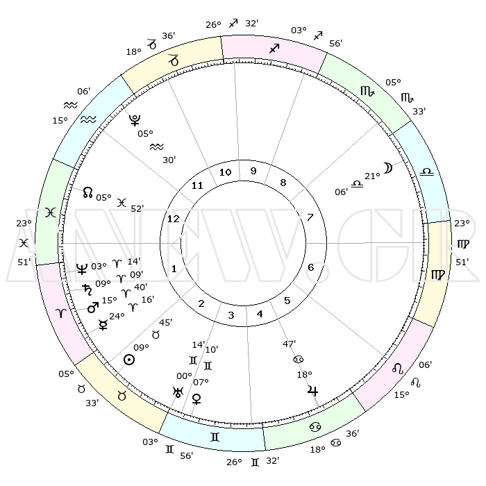 | | ΘΕΣΕΙΣ ΠΛΑΝΗΤΩΝ ΑΣΤΡΟΛΟΓΙΚΟΥ ΧΑΡΤΗ ΤΗΣ ΣΤΙΓΜΗΣ ΑΥΤΗΣ | | | | Πλανήτης | Ζώδιο | Μοίρες | Δεκαήμ. | Σε οίκο | Απόκλιση | | Ακμές των οίκων | | Ηλιος | Ταύρος | 09°42' | Πρώτο | 2 | 14 N 43 | | 1ος | 29°48' | Υδροχόος | | Σελήνη | Ζυγός | 20°35' | Τρίτο | 8 | 11 S 16 | | 2ος | 15°14' | Κριός | | Ερμής | Κριός | 24°11' | Τρίτο | 2 | 07 N 29 | | 3ος | 17°59' | Ταύρος | | Αφροδίτη | Δίδυμοι | 07°07' | Πρώτο | 3 | 22 N 20 | | 4ος | 12°25' | Δίδυμοι | | Αρης | Κριός | 15°38' | Δεύτερο | 2 | 05 N 20 | | 5ος | 04°06' | Καρκίνος | | Δίας | Καρκίνος | 18°47' | Δεύτερο | 5 | 22 N 30 | | 6ος | 27°38' | Καρκίνος | | Κρόνος | Κριός | 09°09' | Πρώτο | 1 | 01 N 38 | | 7ος | 29°48' | Λέων | | Ουρανός | Δίδυμοι | 00°13' | Πρώτο | 3 | 20 N 02 | | 8ος | 15°14' | Ζυγός | | Ποσειδώνας | Κριός | 03°14' | Πρώτο | 1 | 00 N 04 | | 9ος | 17°59' | Σκορπιός | | Πλούτωνας | Υδροχόος | 05°30' | Πρώτο | 12 | 22 S 49 | | 10ος | 12°25' | Τοξότης | | Β. Δεσμός | Ιχθείς | 05°52' | Πρώτο | 1 | 09 S 21 | | 11ος | 04°06' | Αιγόκερως | | Ωροσκόπος | Υδροχόος | 29°48' | Τρίτο | | | 12ος | 27°38' | Αιγόκερως | | Μεσουράνημα | Τοξότης | 12°25' | Δεύτερο | | | |
