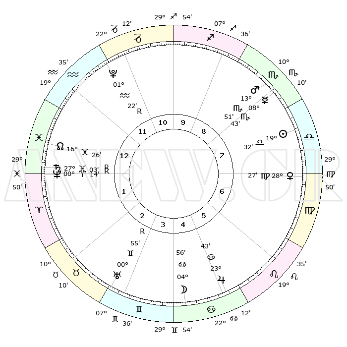 | ΘΕΣΕΙΣ ΠΛΑΝΗΤΩΝ ΑΣΤΡΟΛΟΓΙΚΟΥ ΧΑΡΤΗ ΤΗΣ ΣΤΙΓΜΗΣ ΑΥΤΗΣ | | Πλανήτης | Ζώδιο | Μοίρες | Δεκαήμ. | Σε οίκο | Απόκλιση | | Ακμές των οίκων | Ηλιος | Ζυγός | 19°27' | Δεύτερο | 8 | 07 S 36 | | 1ος | 06°58' | Υδροχόος | Σελήνη | Καρκίνος | 03°33' | Πρώτο | 5 | 28 N 24 | | 2ος | 22°02' | Ιχθείς | Ερμής | Σκορπιός | 08°35' | Πρώτο | 9 | 15 S 44 | | 3ος | 29°17' | Κριός | Αφροδίτη | Παρθένος | 28°19' | Τρίτο | 8 | 02 N 02 | | 4ος | 26°36' | Ταύρος | Αρης | Σκορπιός | 13°47' | Δεύτερο | 9 | 16 S 10 | | 5ος | 18°55' | Δίδυμοι | Δίας | Καρκίνος | 23°42' | Τρίτο | 6 | 21 N 24 | | 6ος | 10°39' | Καρκίνος | Κρόνος | Ιχθείς | 27°03'R | Τρίτο | 2 | 03 S 28 | | 7ος | 06°58' | Λέων | Ουρανός | Δίδυμοι | 00°56'R | Πρώτο | 4 | 20 N 08 | | 8ος | 22°02' | Παρθένος | Ποσειδώνας | Κριός | 00°14'R | Πρώτο | 2 | 01 S 10 | | 9ος | 29°17' | Ζυγός | Πλούτωνας | Υδροχόος | 01°22'R | Πρώτο | 12 | 23 S 32 | | 10ος | 26°36' | Σκορπιός | Β. Δεσμός | Ιχθείς | 16°26' | Δεύτερο | 1 | 05 S 21 | | 11ος | 18°55' | Τοξότης | Ωροσκόπος | Υδροχόος | 06°58' | Πρώτο | | | 12ος | 10°39' | Αιγόκερως | Μεσουράνημα | Σκορπιός | 26°36' | Τρίτο | | | |