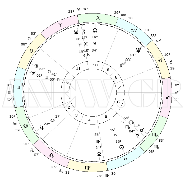 | ΘΕΣΕΙΣ ΠΛΑΝΗΤΩΝ ΑΣΤΡΟΛΟΓΙΚΟΥ ΧΑΡΤΗ ΤΗΣ ΣΤΙΓΜΗΣ ΑΥΤΗΣ | | Πλανήτης | Ζώδιο | Μοίρες | Δεκαήμ. | Σε οίκο | Απόκλιση | | Ακμές των οίκων | Ηλιος | Ζυγός | 16°33' | Δεύτερο | 7 | 06 S 30 | | 1ος | 09°43' | Ιχθείς | Σελήνη | Ταύρος | 20°44' | Τρίτο | 2 | 22 N 23 | | 2ος | 24°02' | Κριός | Ερμής | Σκορπιός | 04°20' | Πρώτο | 8 | 14 S 01 | | 3ος | 24°53' | Ταύρος | Αφροδίτη | Παρθένος | 24°42' | Τρίτο | 7 | 03 N 26 | | 4ος | 18°26' | Δίδυμοι | Αρης | Σκορπιός | 11°46' | Δεύτερο | 8 | 15 S 31 | | 5ος | 10°09' | Καρκίνος | Δίας | Καρκίνος | 23°25' | Τρίτο | 5 | 21 N 26 | | 6ος | 04°47' | Λέων | Κρόνος | Ιχθείς | 27°15'R | Τρίτο | 1 | 03 S 24 | | 7ος | 09°43' | Παρθένος | Ουρανός | Δίδυμοι | 01°00'R | Πρώτο | 3 | 20 N 09 | | 8ος | 24°02' | Ζυγός | Ποσειδώνας | Κριός | 00°19'R | Πρώτο | 1 | 01 S 08 | | 9ος | 24°53' | Σκορπιός | Πλούτωνας | Υδροχόος | 01°22'R | Πρώτο | 11 | 23 S 32 | | 10ος | 18°26' | Τοξότης | Β. Δεσμός | Ιχθείς | 16°35' | Δεύτερο | 1 | 05 S 18 | | 11ος | 10°09' | Αιγόκερως | Ωροσκόπος | Ιχθείς | 09°43' | Πρώτο | | | 12ος | 04°47' | Υδροχόος | Μεσουράνημα | Τοξότης | 18°26' | Δεύτερο | | | |